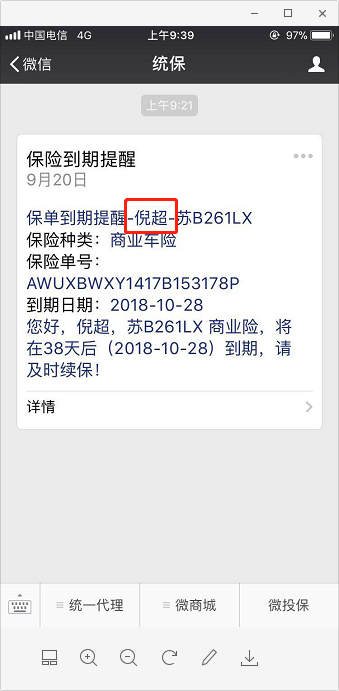 微信端推送消息时,消息接收人的名称与保单信息不一致。