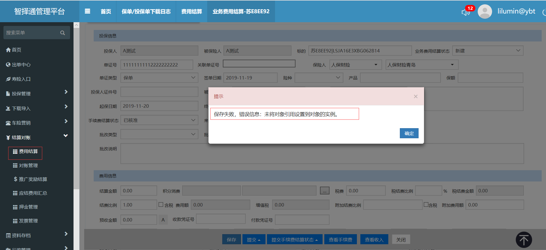 费用结算,选择一条数据编辑,点击保存提示未将对象引用到实例。提交状态到结算完毕,同样问题