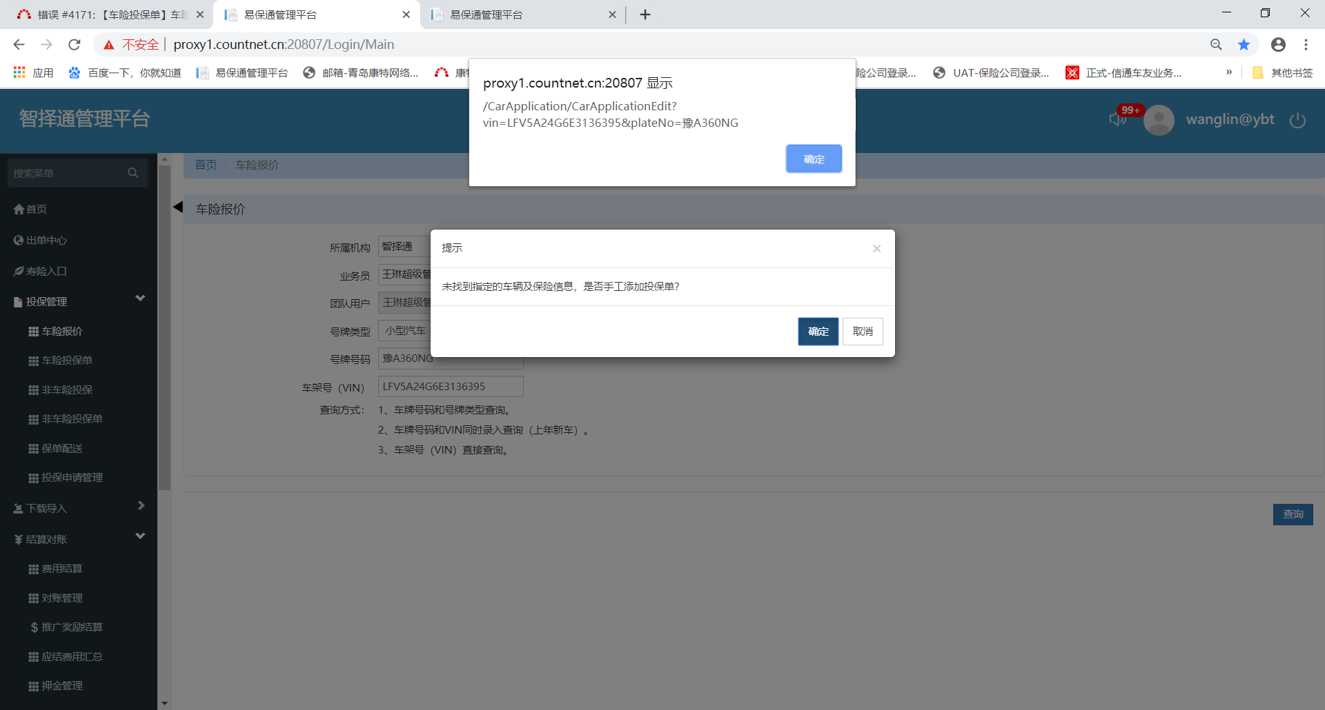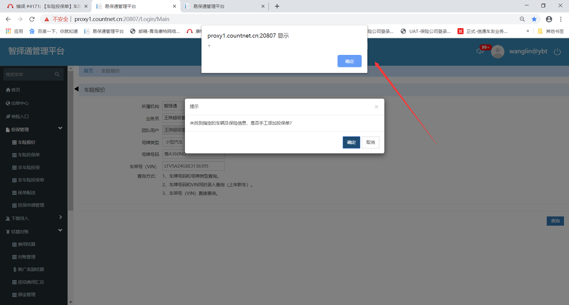 【车险投保单】测试环境。车险报价->输入车牌号和车架号->未查到续保信息,点击确定,分别会有如图提示。见附图