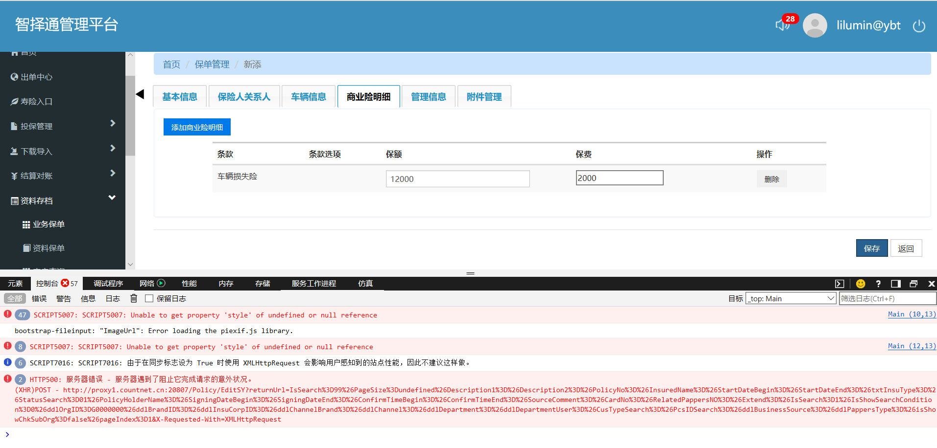 业务保单新添商业险,编辑信息后点击保存,无反应F12报错