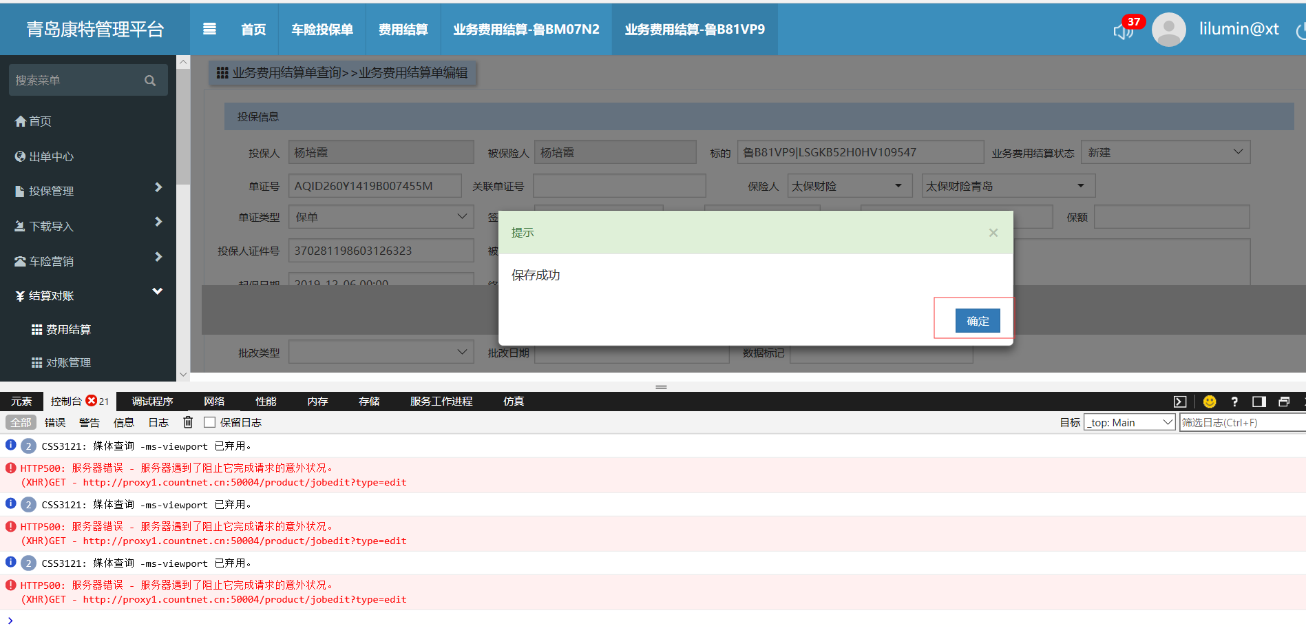 费用结算,选择一条数据编辑点击保存提示保存成功,点击确定F12报错
