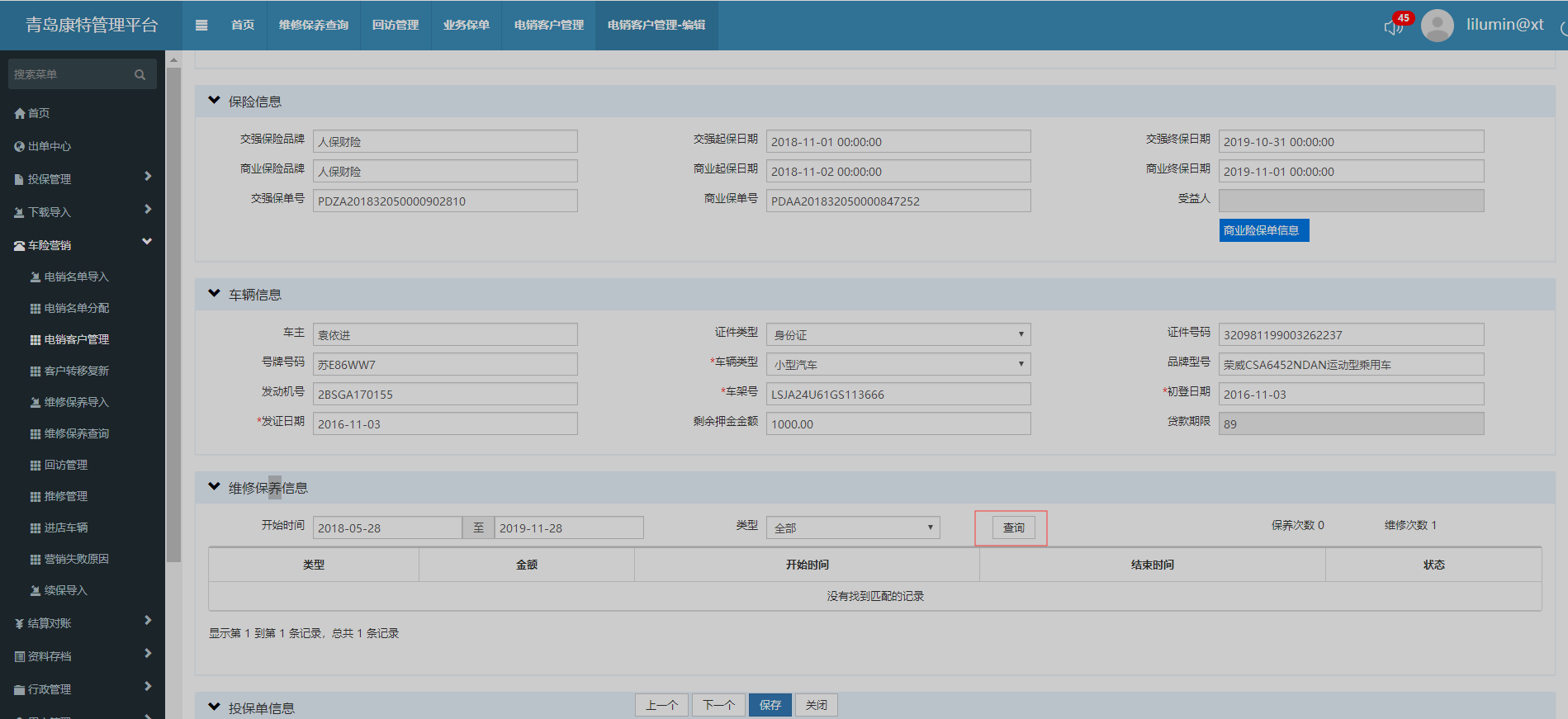 电销客户管理编辑界面,存在维修保养信息,不点击查询按钮不显示维修记录。