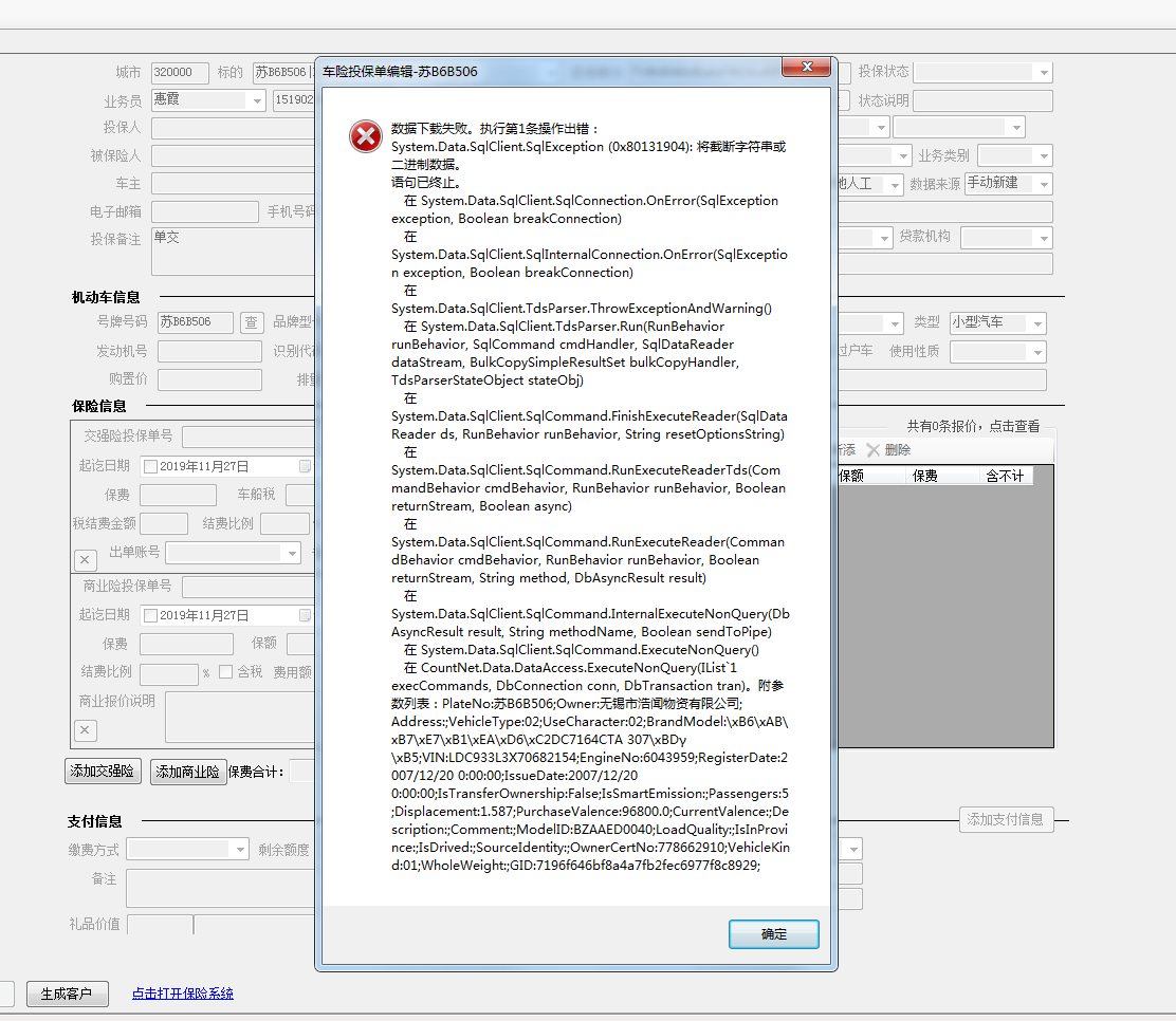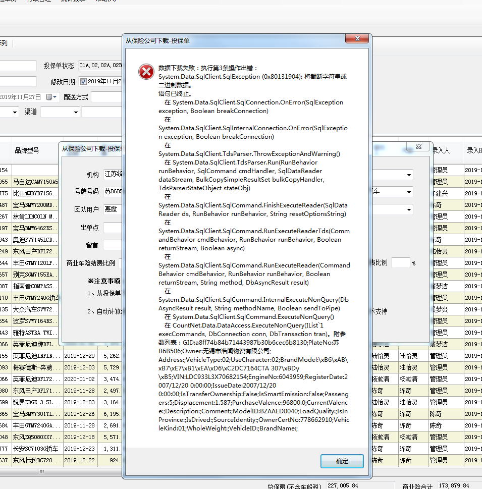 描述:客户在投保单编辑页面提交至已报价的过程中,选择从保险公司下载投保单,系统提示:“数据下载失败,执行第1条操作出错”,从客户再次从