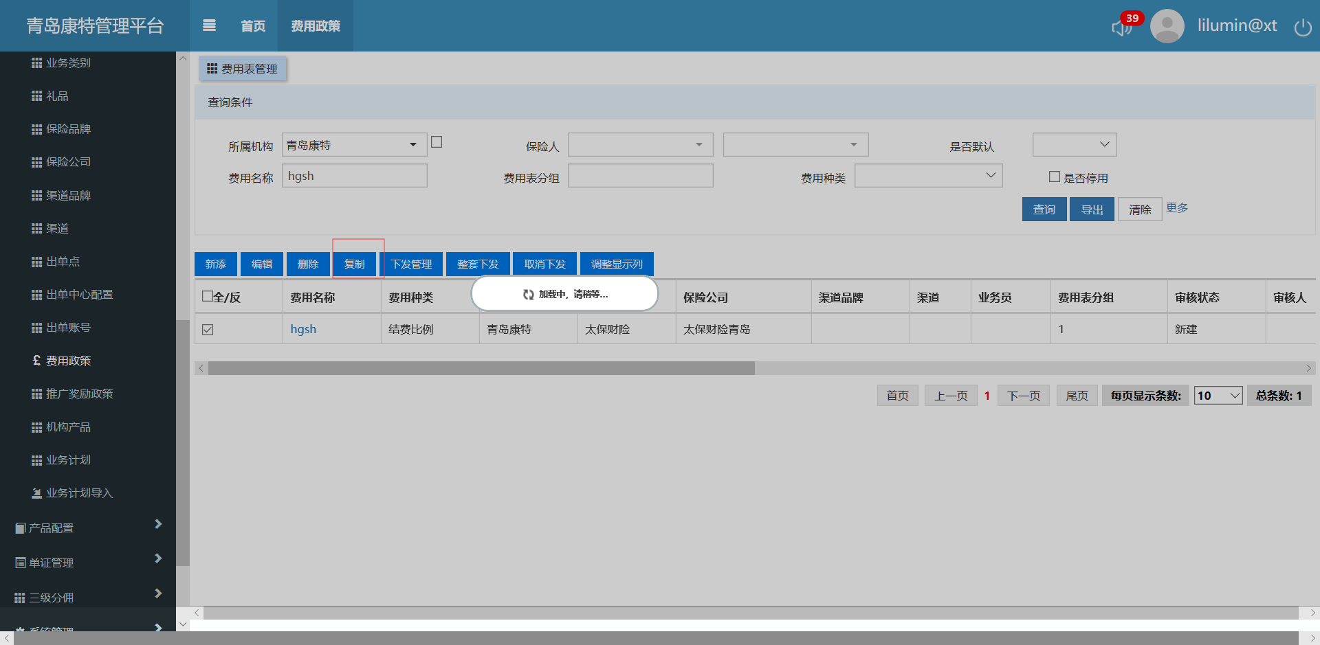 费用政策,选择一条数据点击复制,一直在缓冲界面
