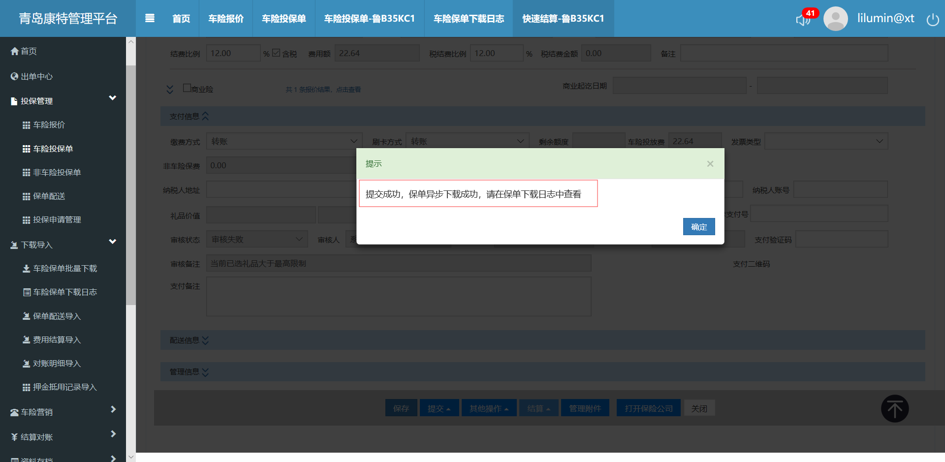 投保单状态从核保通过待支付提交至已出单时,提示提交成功,保单异步下载成功