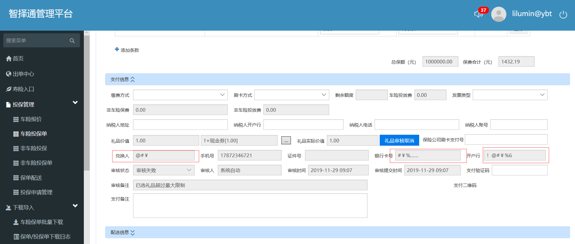 便捷下载保单,礼品选择现金券时,银行卡号输入非数字可以下载成功,没有格式验证