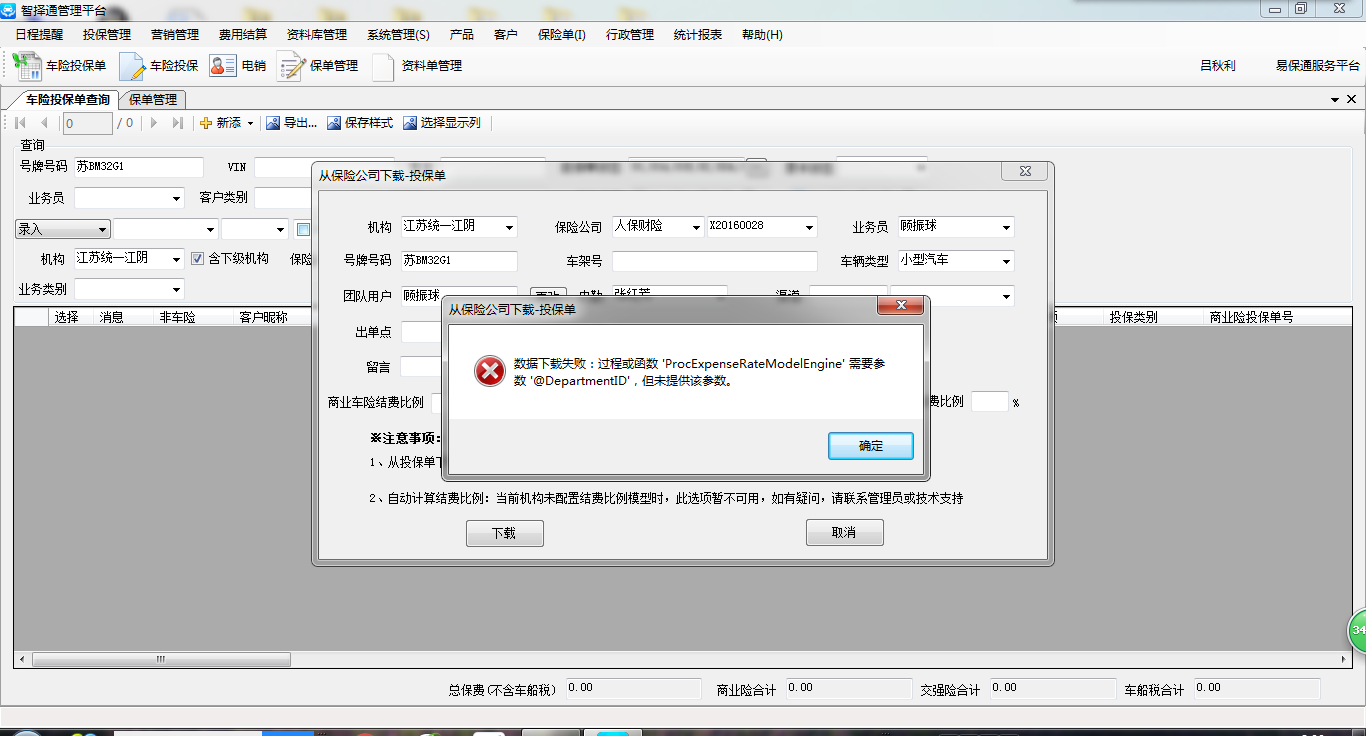 描述:模拟客户在从“保险公司下载投保单”,提示数据下载失败,过程或函数‘ProExpenseRateModelEngine'需要参数“@Department ID",但未提供该参数