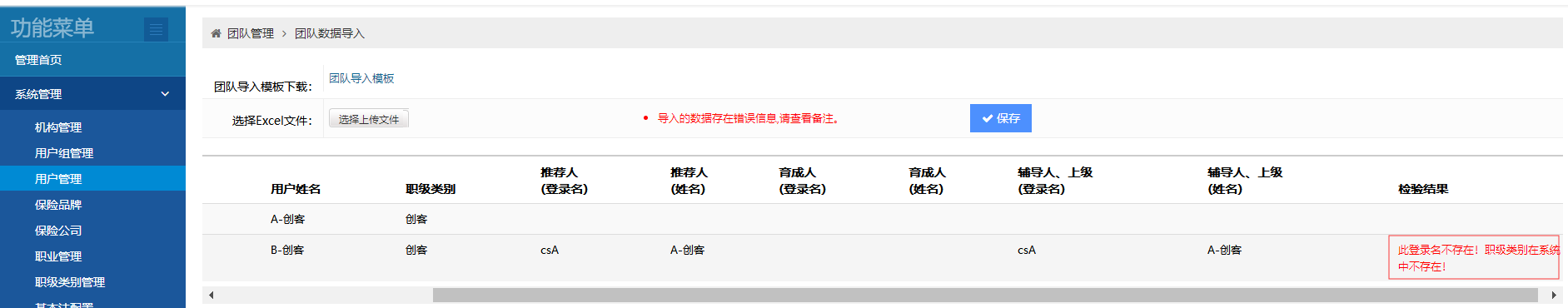 【用户管理】团队导入,存在此登录名和职级类别,提示不存在