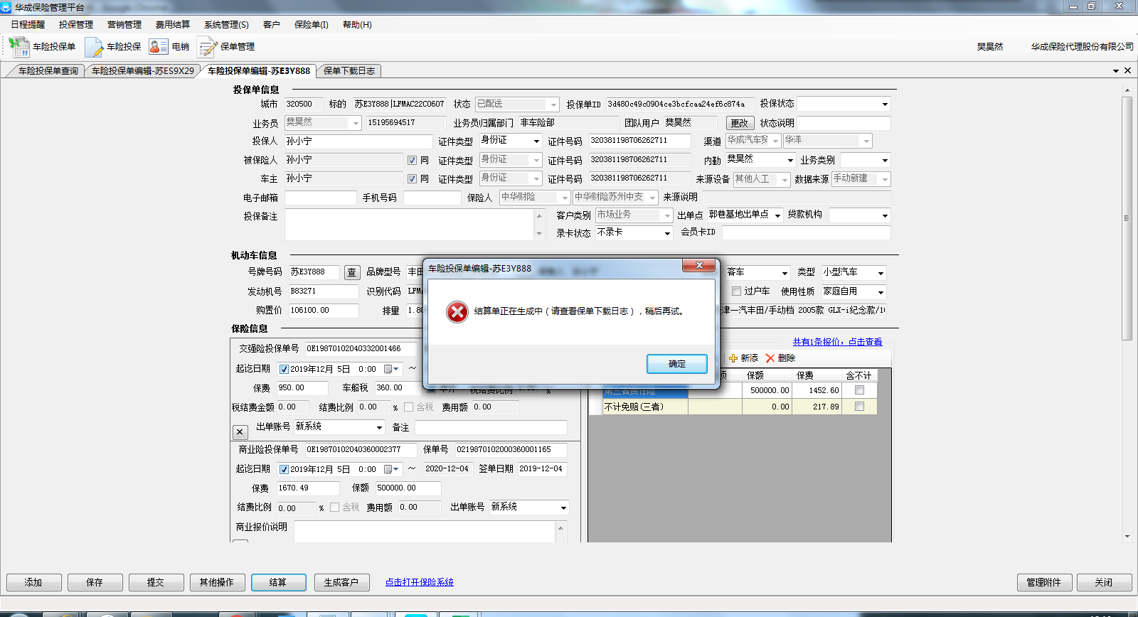 [苏州华成]投保单提交到已出单过程中,结算单无法生成