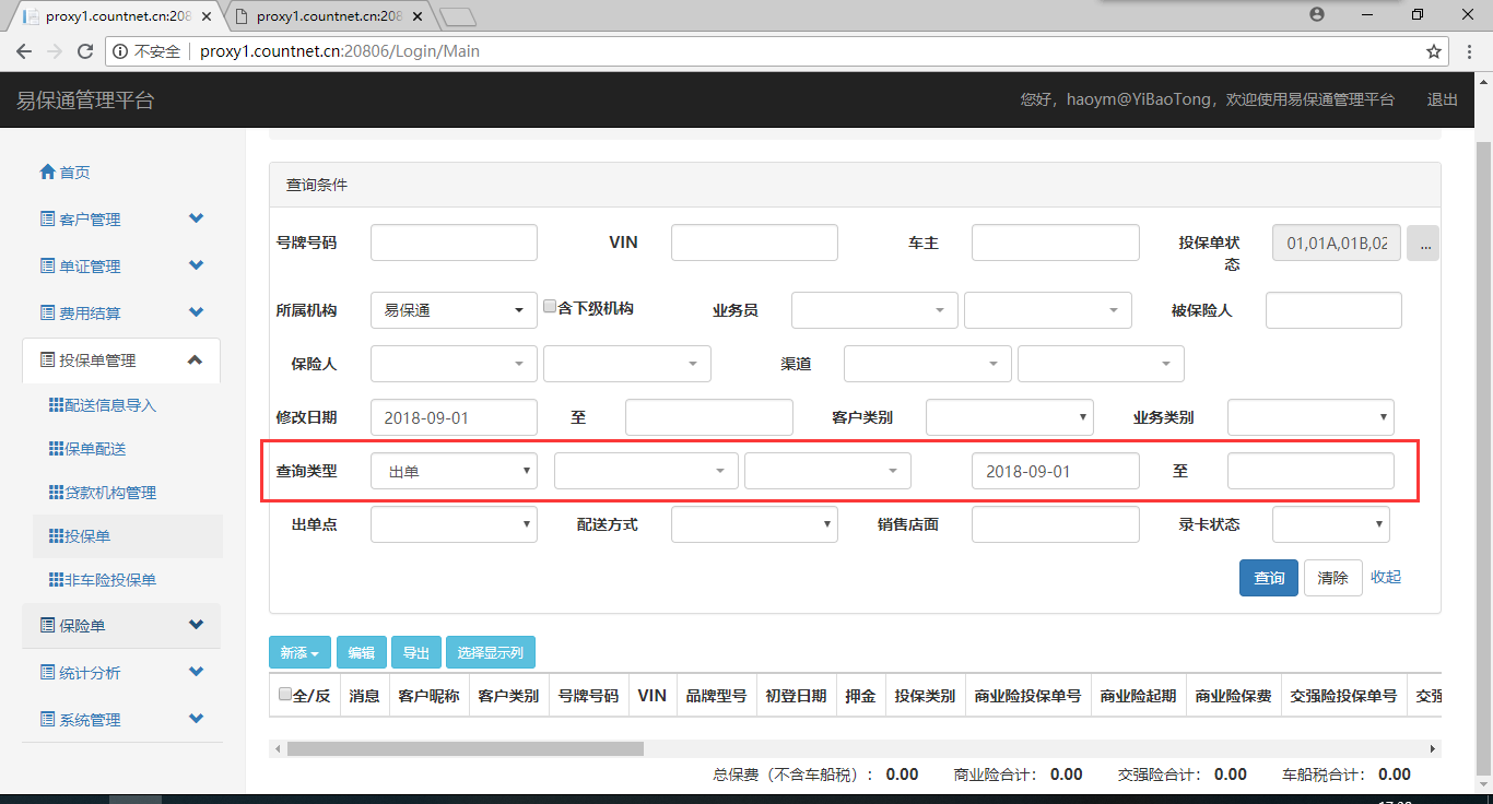 【速成高级版】投保单查询页面,查询类型选择出单,时间设置为2018-9-1,查询不到数据如图