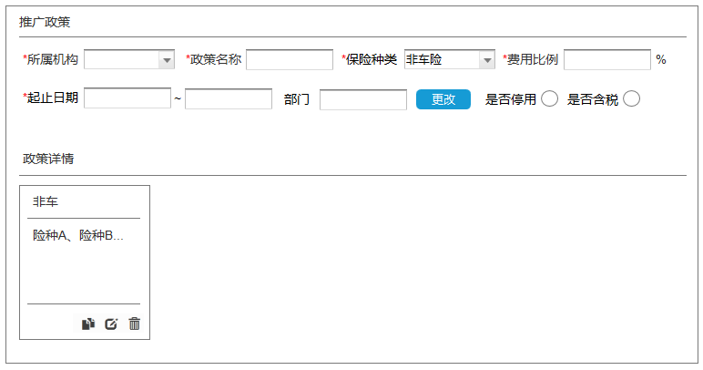 1、推广奖励照附件中的图1进行升级,其中保险种类与费用政策一致,分为车险、非车险。部门与费用政策一致。政策详情也与费用政策一致。