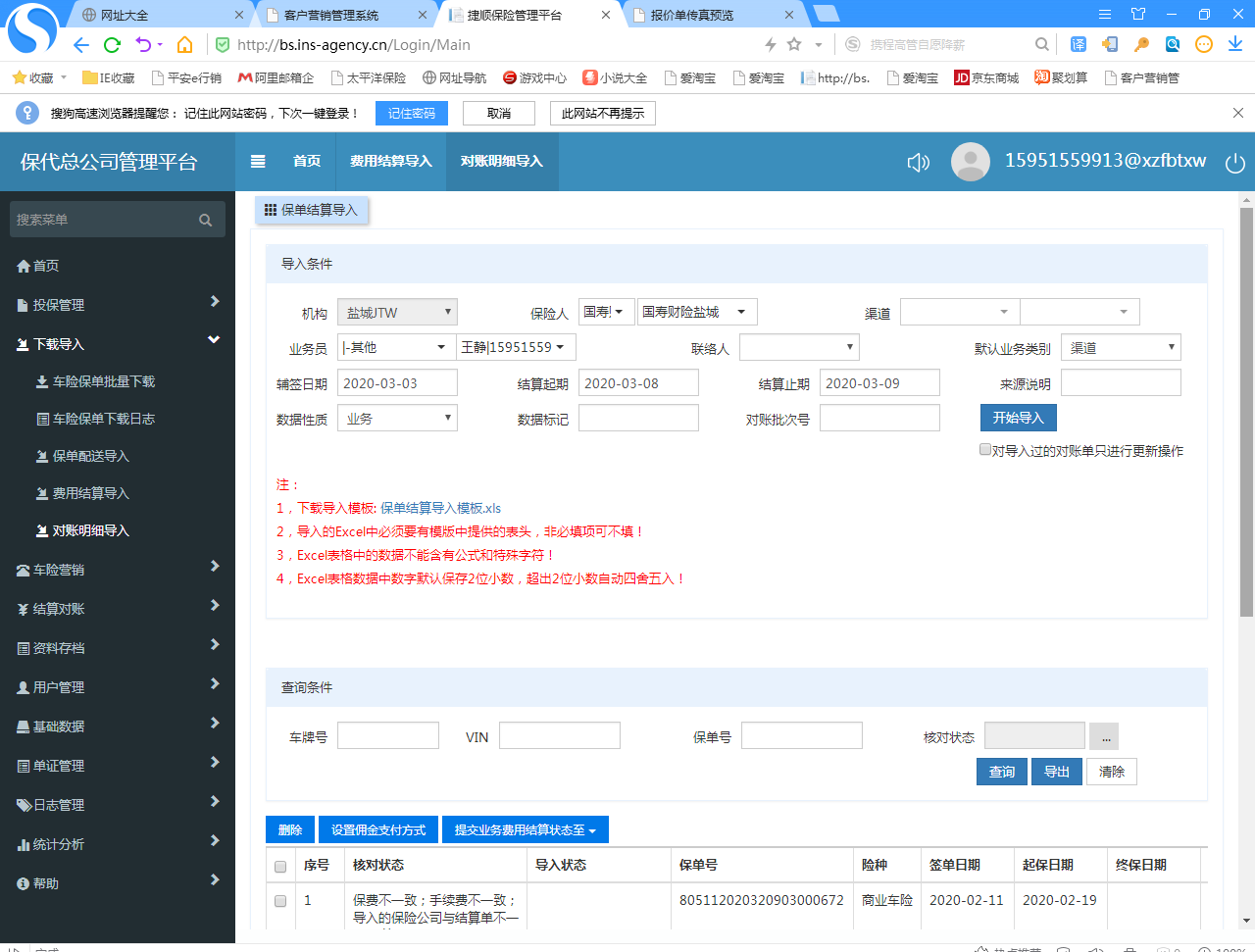 捷顺内勤同样的一套数据先导入结算单,在导入对账管理,核对失败。并无数据不一致的情况。具体的导入模板请见附件。