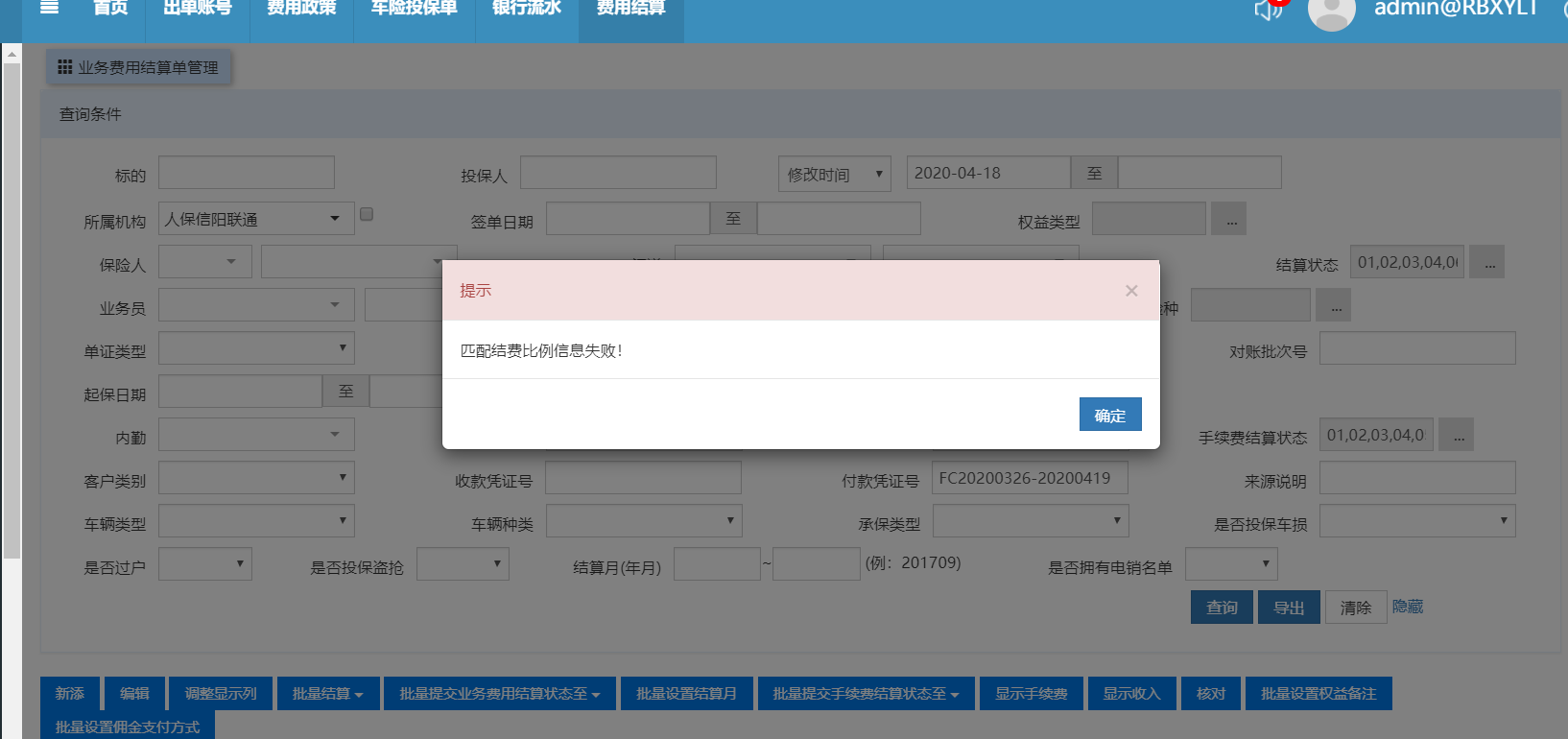 结算单非车险重新匹配费用政策失败,举例 豫SP6K95