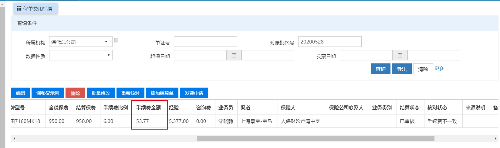 捷顺对账管理错误手续费一致但是系统显示不一致。错误车辆:保代总公司保单号:PDZA201732020000287295对账批次号:20200528