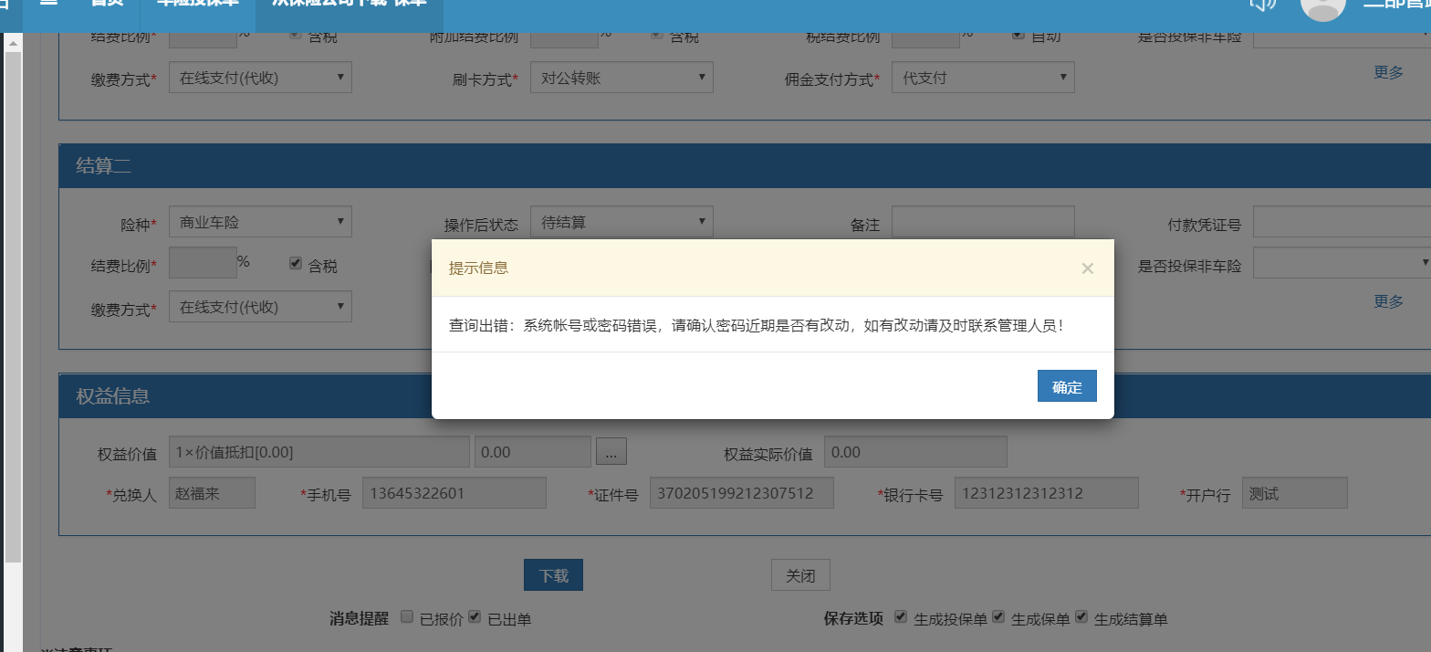 人保电销下载保单报错,账号密码不对,如图1所示,但是账号密码是可以正常登陆人保系统的。