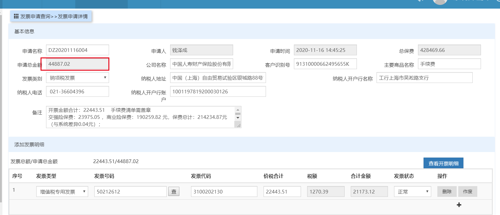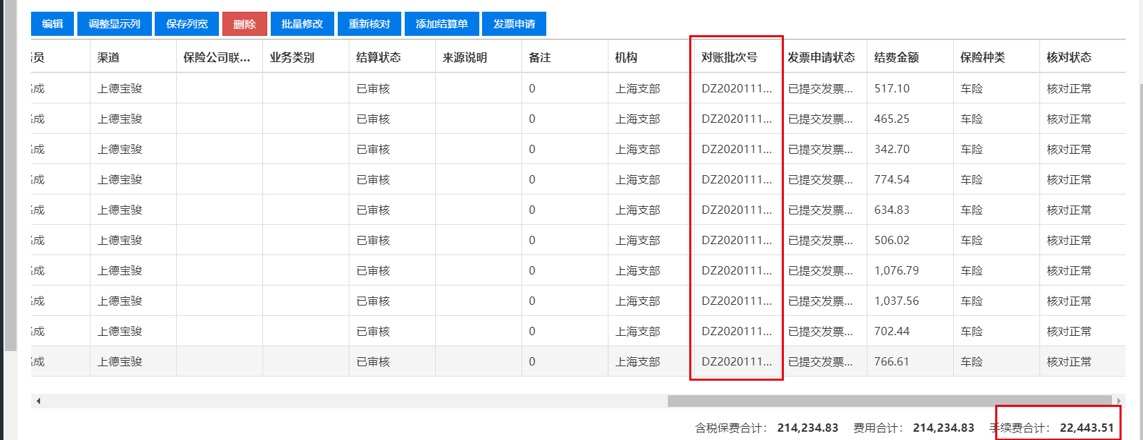 发票管理发票申请总金额与对应对账数据不一致,错误对账批次号DZ20201116004,发票申请名称DZ20201116004