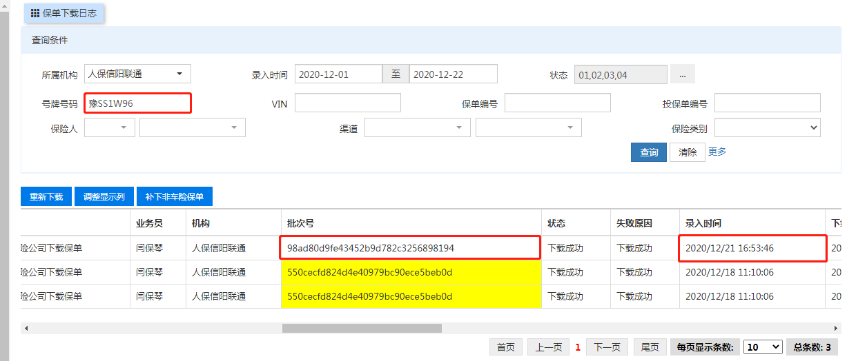 下载日志中非车批次号与车险批次号未匹配对应,详情如下图: