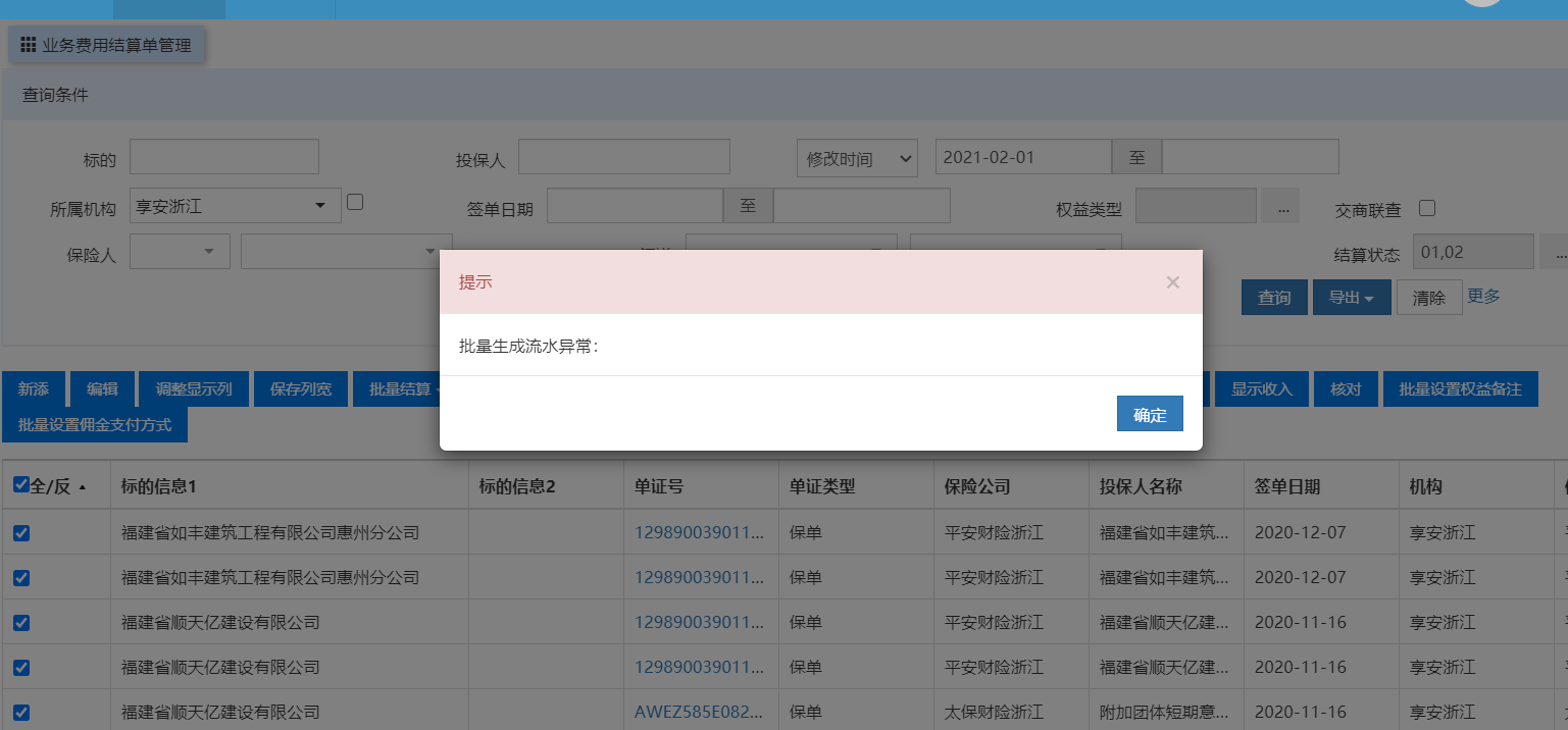 结算单20单以上无法进行正常汇总生成流水问题机构:鼎慧保服务器,享安浙江