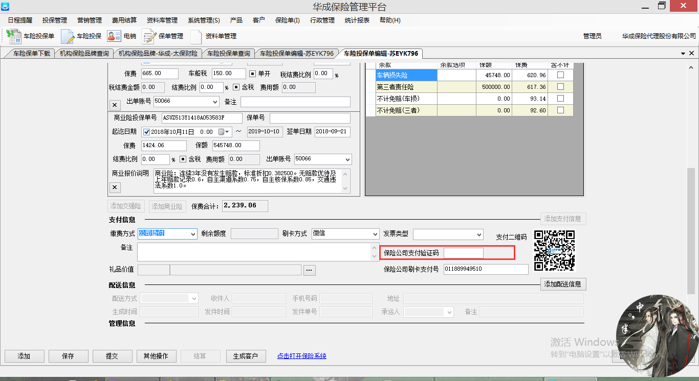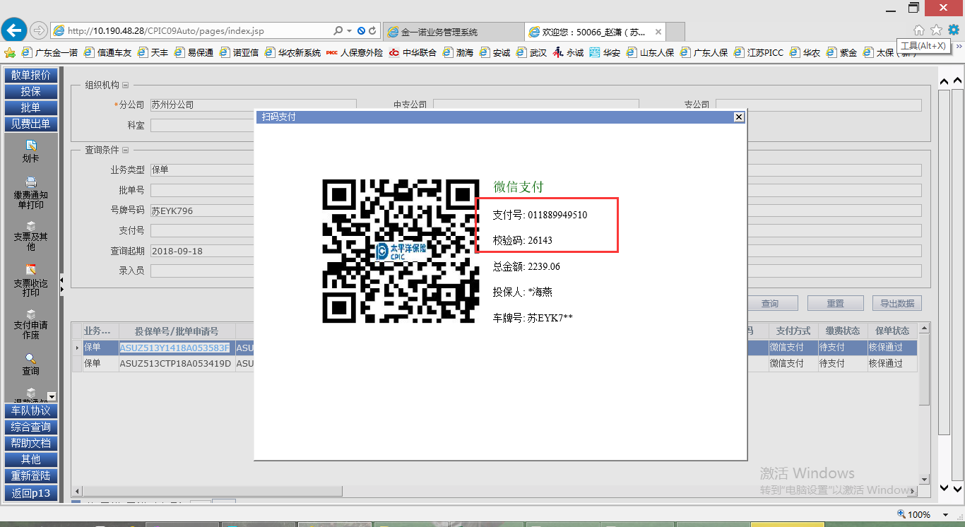 上述车在保险公司系统内有支付信息,使用华成系统下载时系统提示是否需要提交到【核保通过待支付】点击【是】,系统下载的投保单没有验证码。