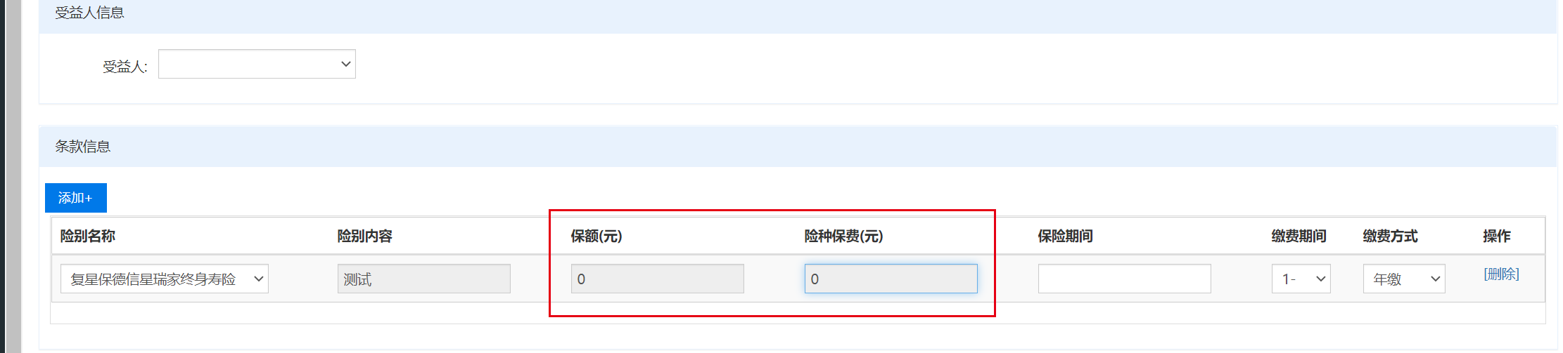 新增投保单,条款信息保额保费应该人工填写,不应该自动带入。