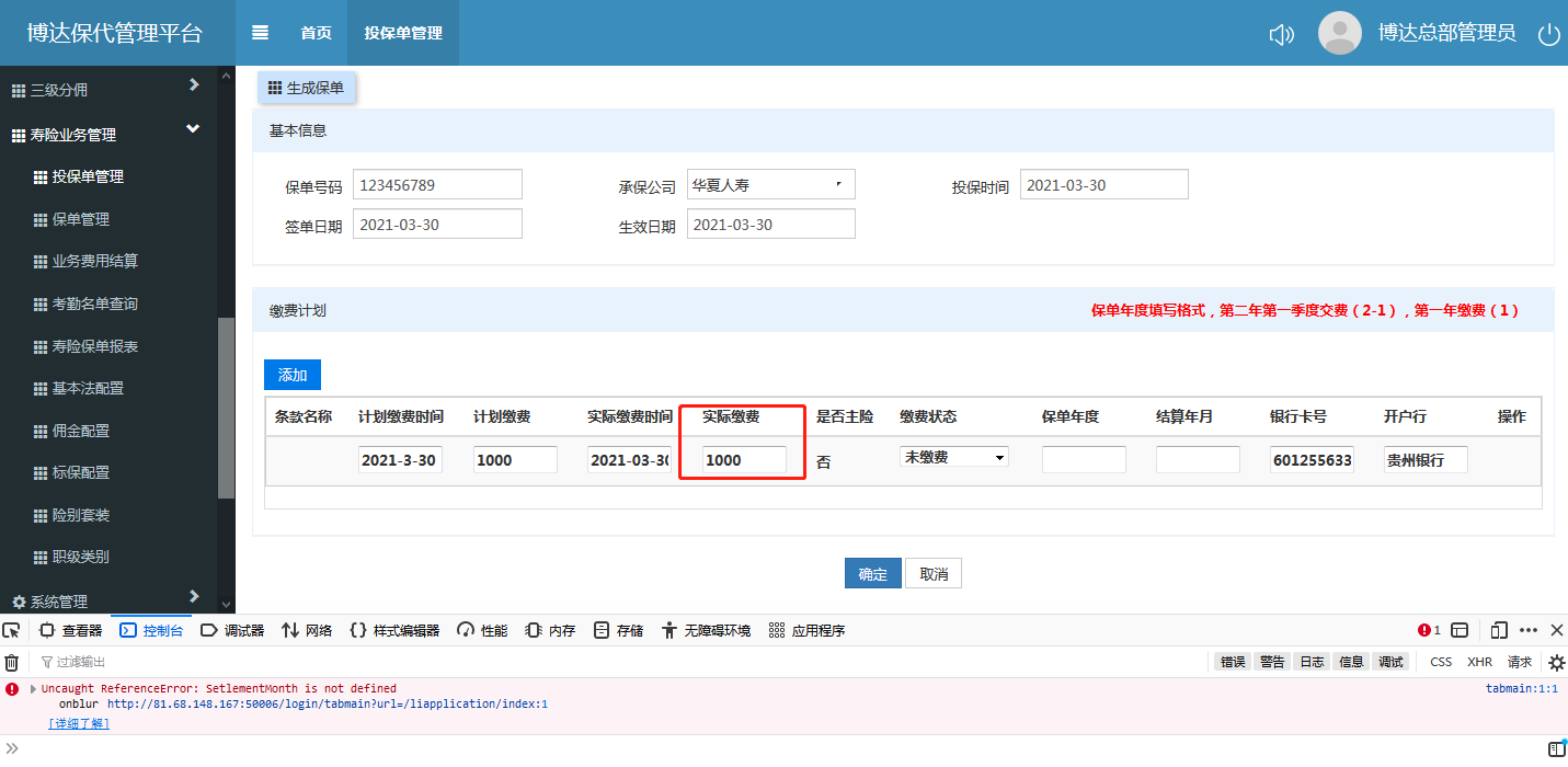 博达服务器,寿险业务管理→投保单管理,提交,选择状态“已出单”,基本信息填好,缴费计划处填写到“实际缴费”时报错