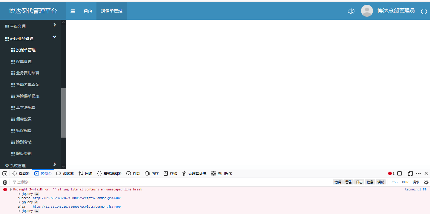 博达服务器,寿险业务管理→投保单管理,查询保单信息,提交保单,生成“已出单”状态,保单信息和缴费信息填好后,提交,页面空白报错详见附件