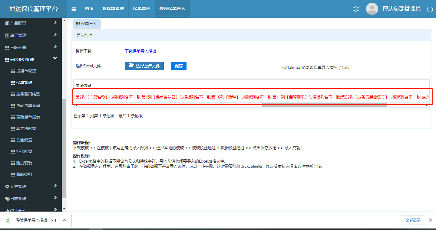 保单管理中的保单导入下载模板后上传源模板后报错(模板未修改,下载后直接上传)详情见截图
