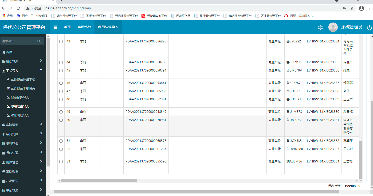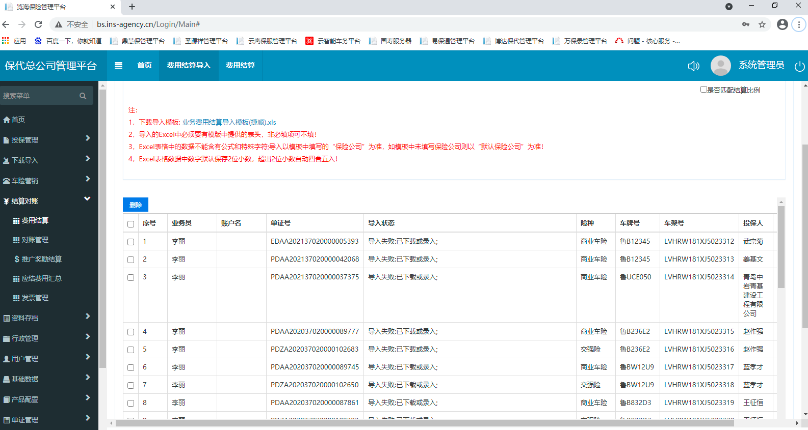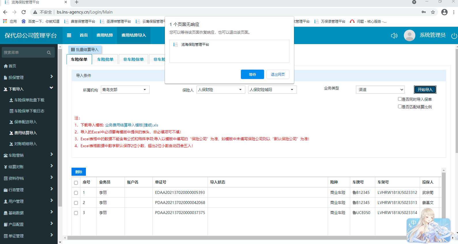 费用结算单导入界面,载入数据正常,点击导入后页面一直弹出无响应界面,该情况一直持续数分钟,直至重新刷新网页,再次导入表格报错,显示数据已导入,打开费用结算界面仅有51条数据,原表格53条数据,两条数据丢失