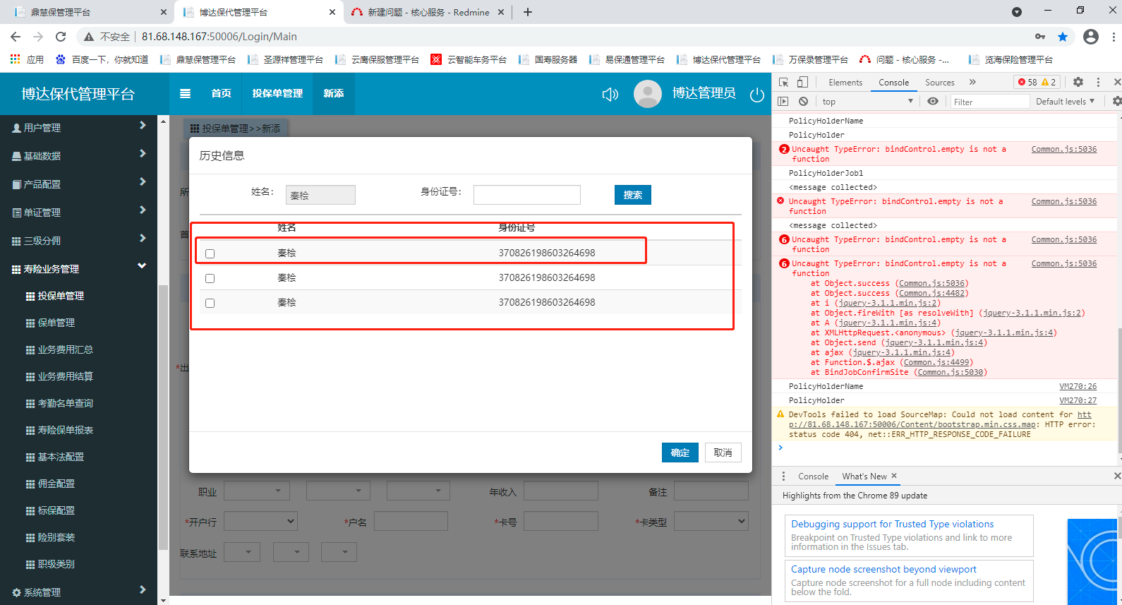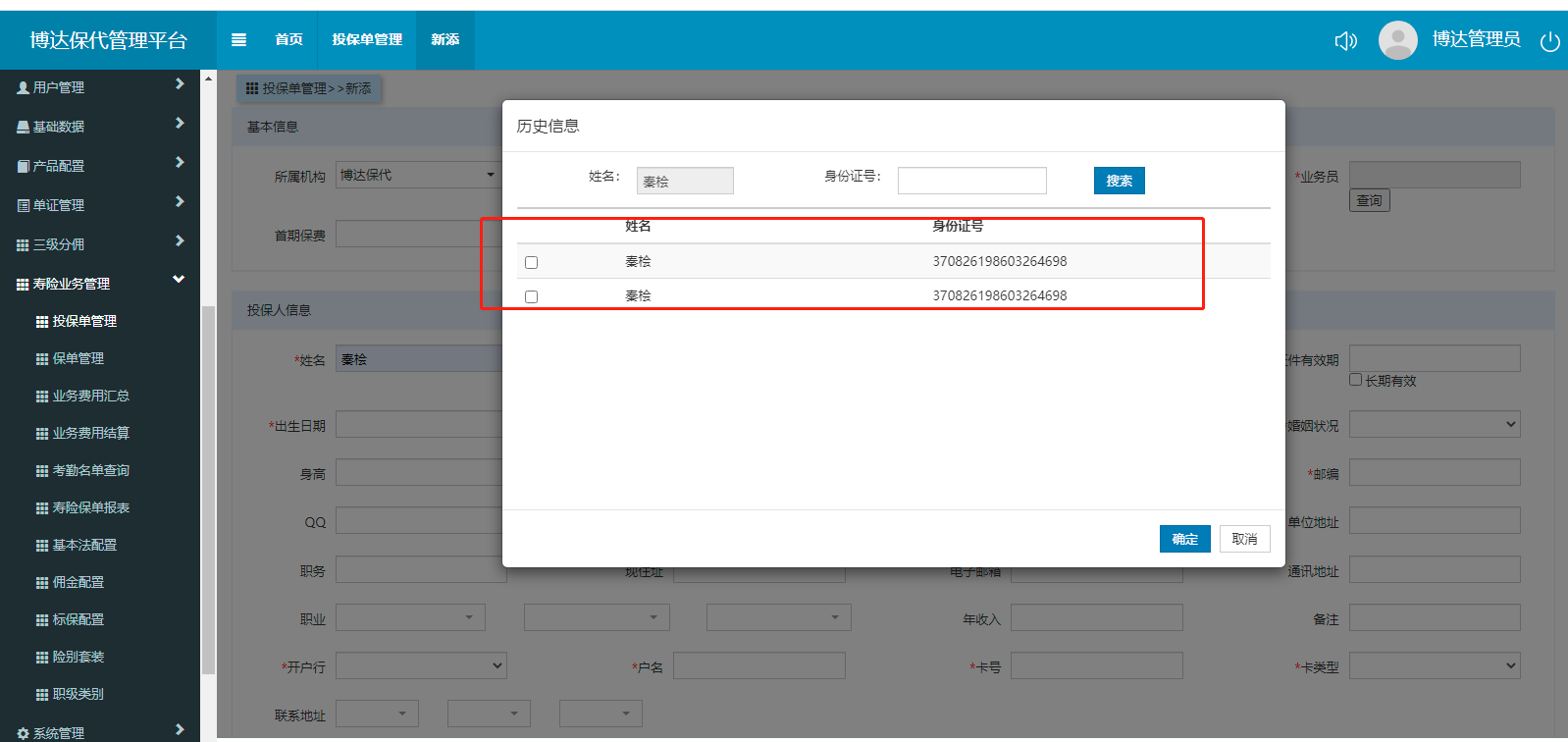 【新寿险】博达服务器 寿险业务→投保单管理→新增 同一投保人历史信息同时出现多个