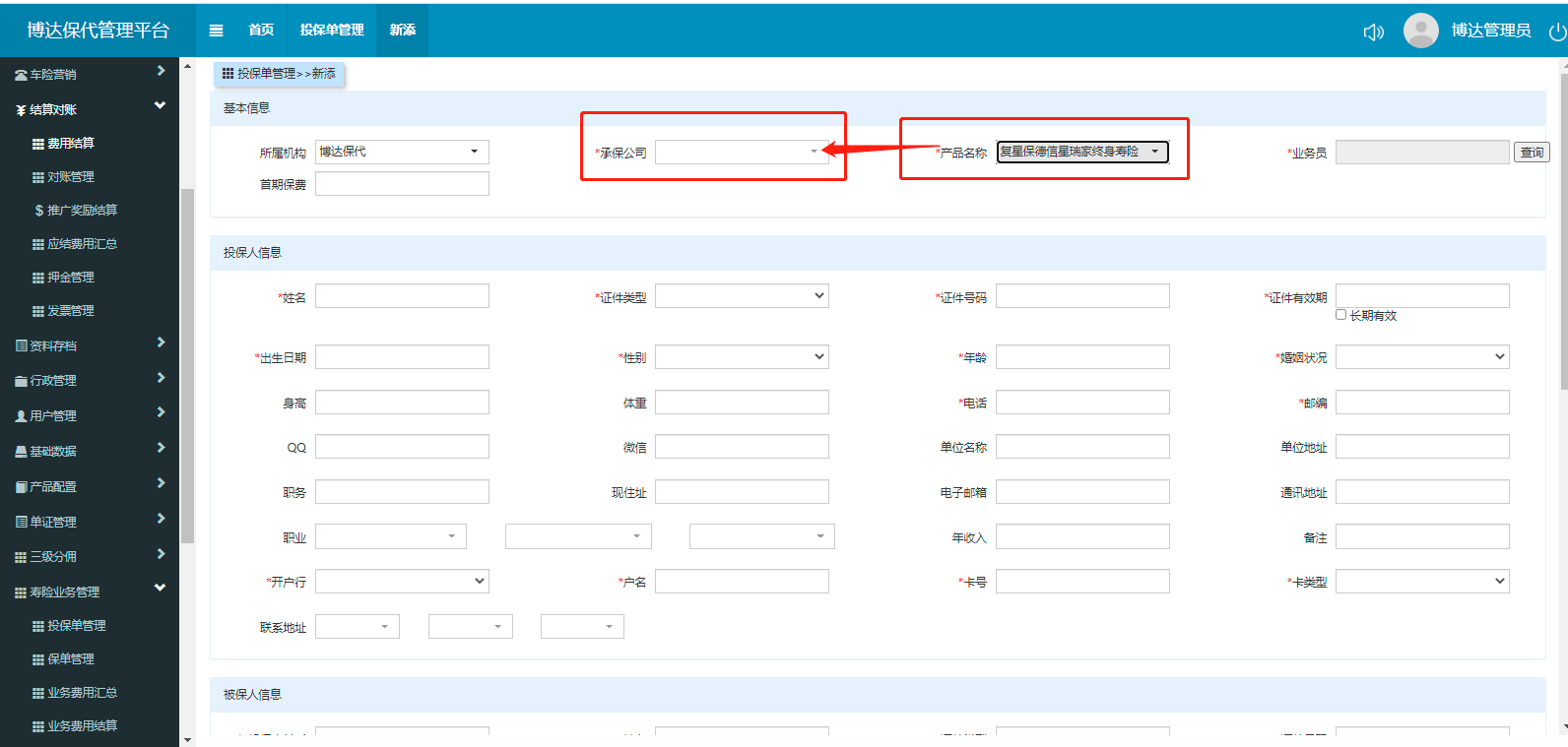 【新寿险】博达服务器 寿险业务→投保单管理→新增 选择产品名称应带出承保公司