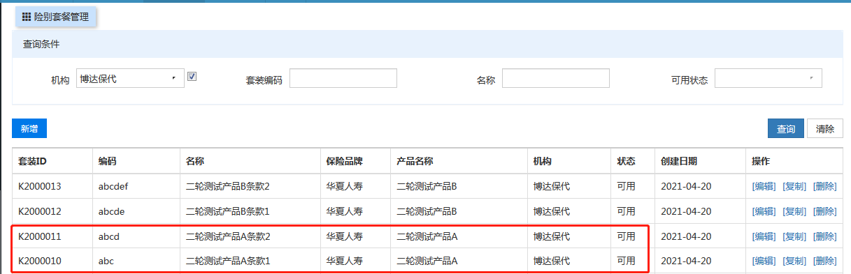 一个产品名称关联了两个不同的套装,生成保单时自带关联的是两个相同的套装。应该是把两种不同的套装都自动关联出来。
