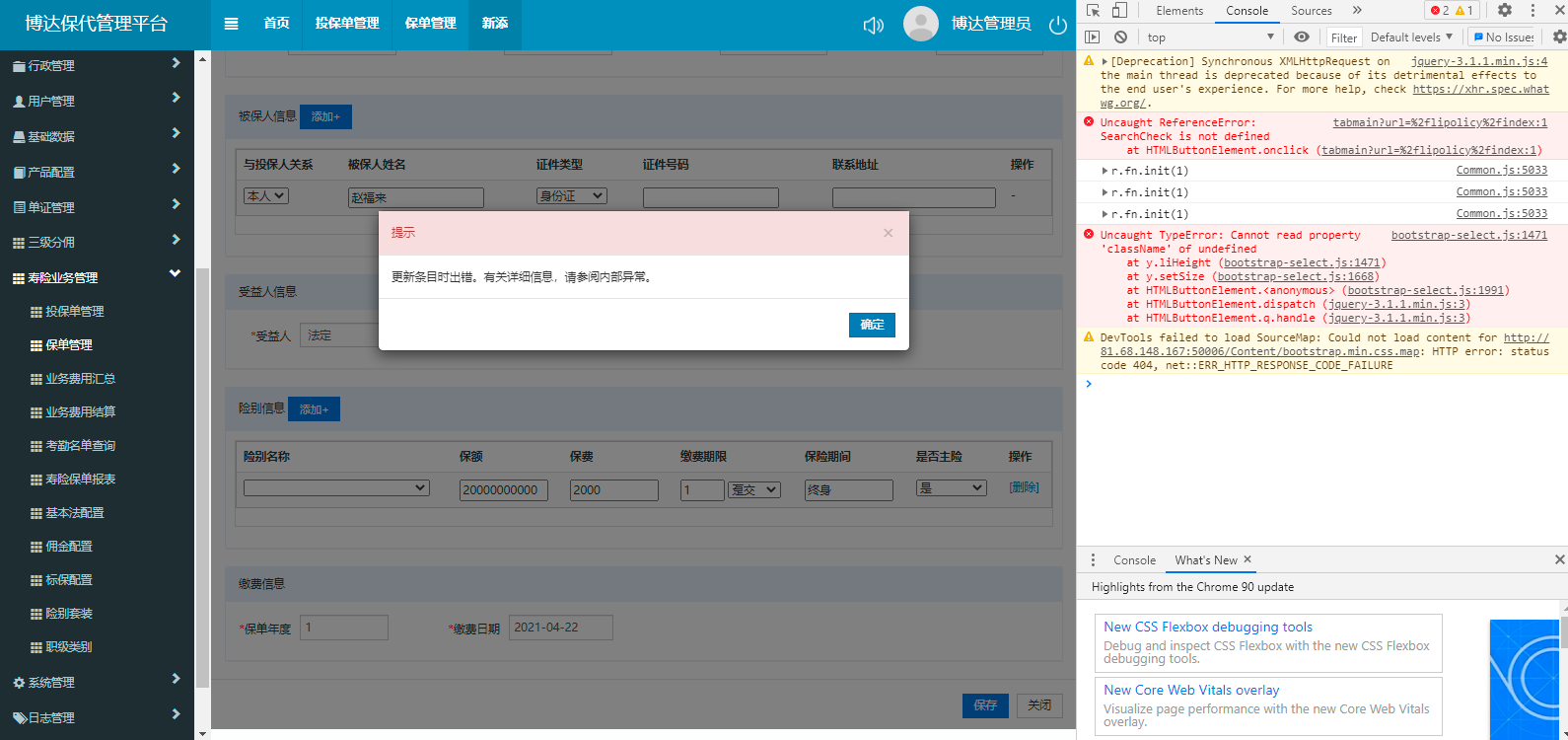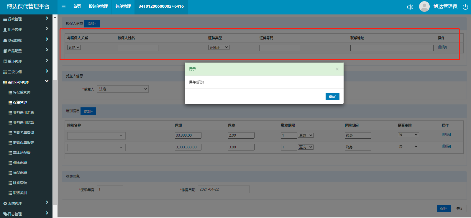 【新寿险】博达服务器 寿险业务→保单管理→新增 未输入被保人身份证保存报错但成功保存