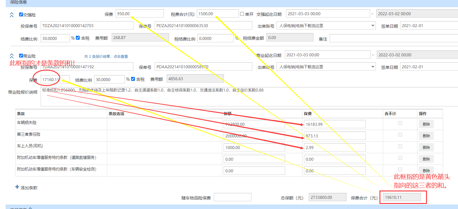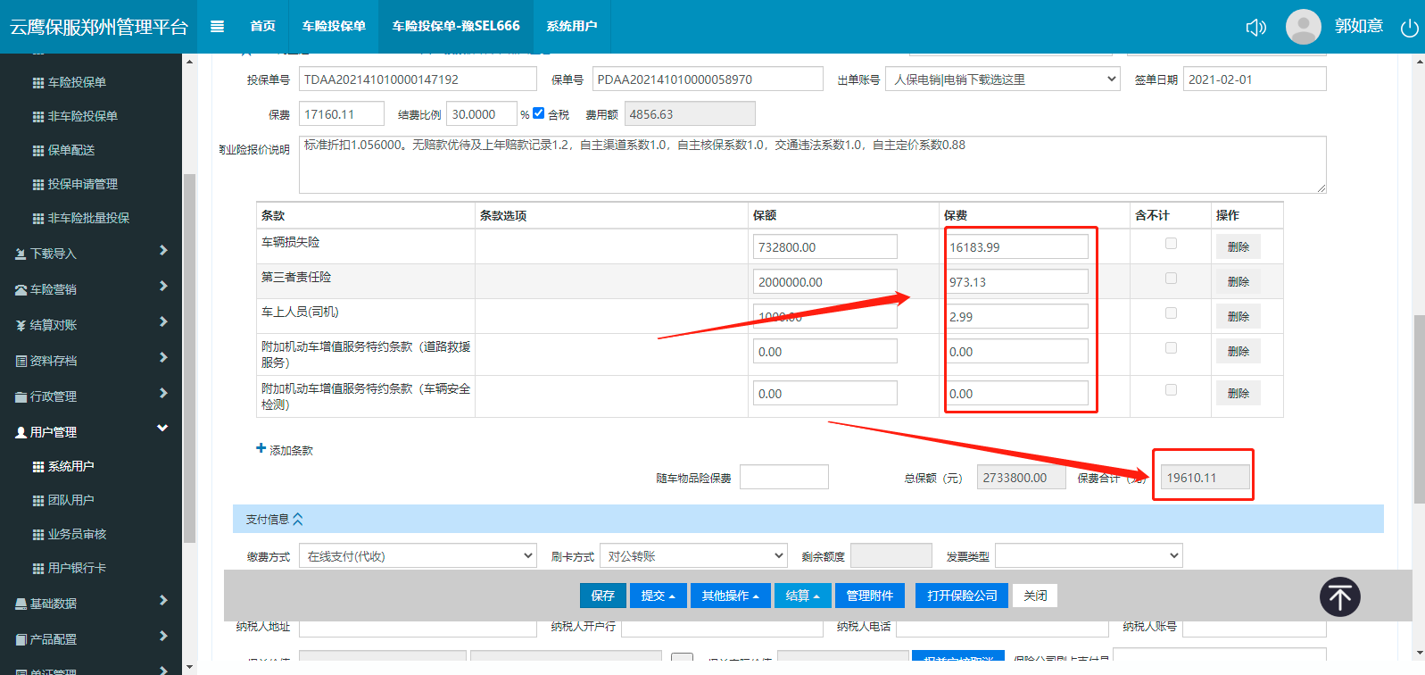 云鹰保服——华保郑汴机构中投保单,车牌号豫SEL666的投保单,商业车险条款保费合计不对,详情见图