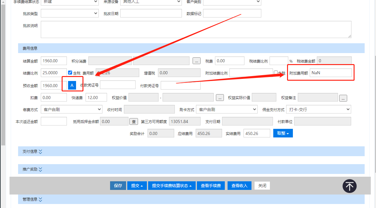 统一服务器中新添的费用结算单子,费用信息中点击A后,附加费用额出现NAN字符