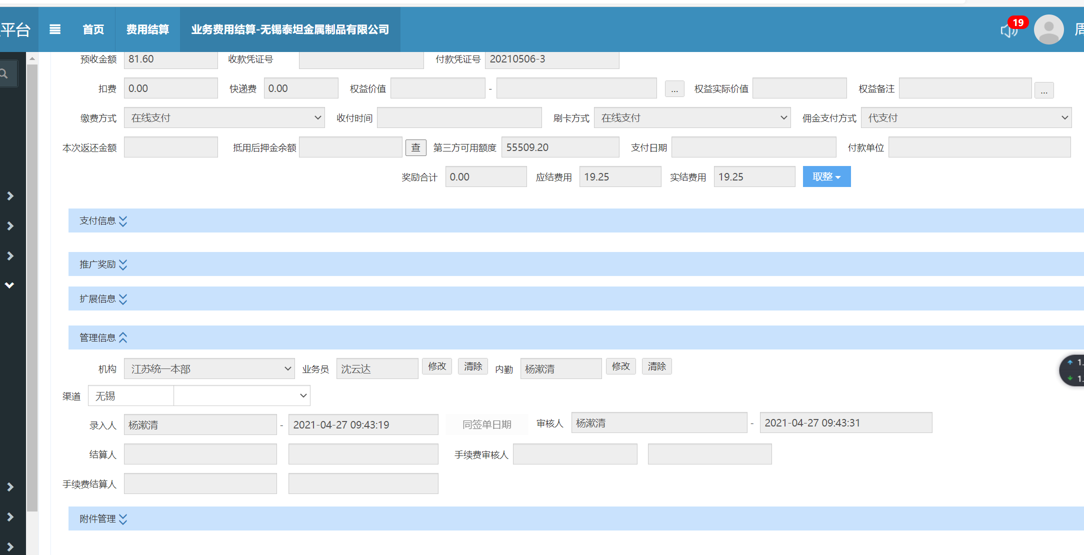 1、银行流水支付渠道是线下支付的,提交状态到审核通过,现在无法提交到已到账。报错截图如图1所示。2、结算完毕消息提醒应该推送到业务员而不是内勤,如图2、图3所示,业务员为沈云达,内勤为杨漱清,结果杨漱清收到了已到账消息提醒。