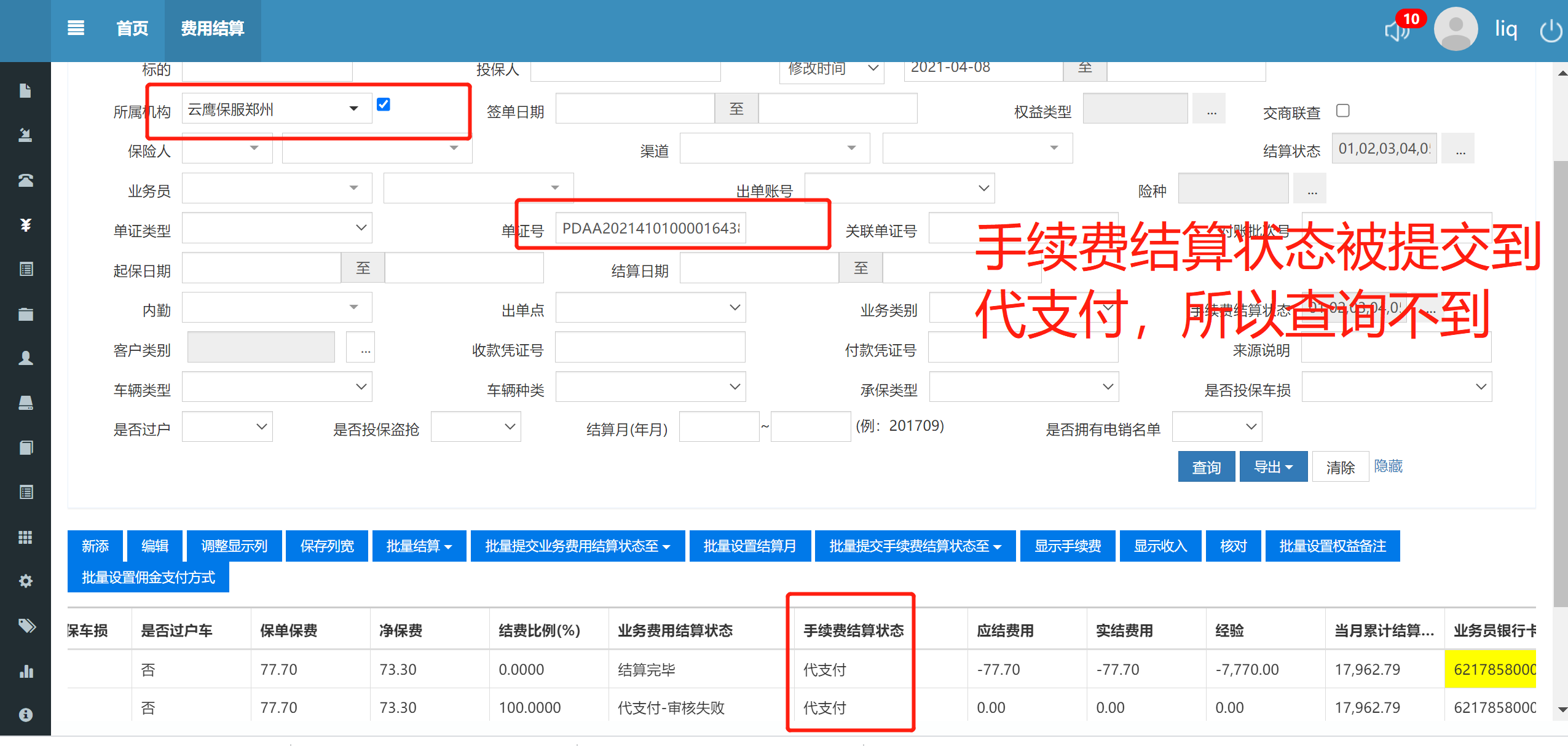 因手续费状态被提交到代支付,查询时未选择手续费状态所以查不到。