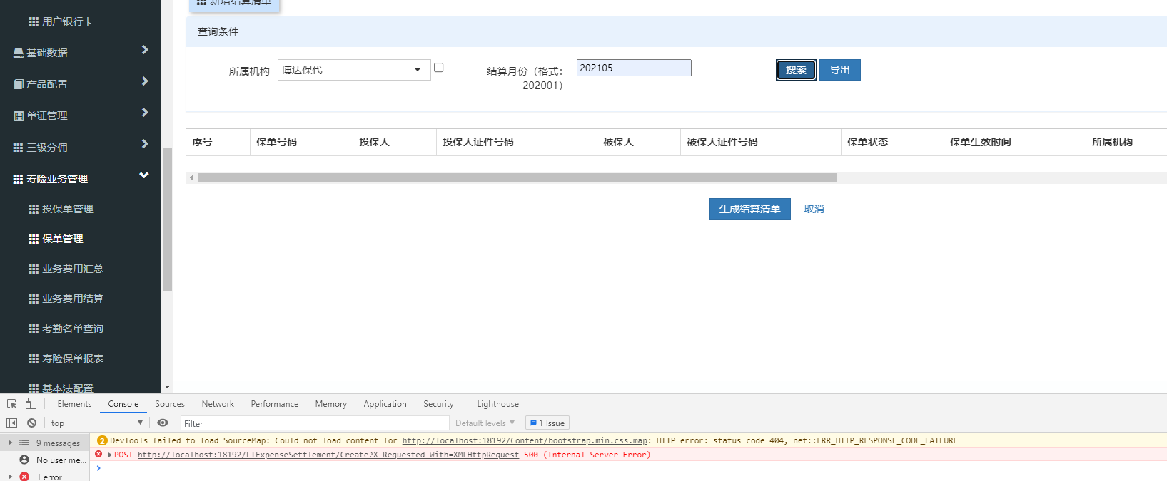 新建投保单生成保单再去结算,在业务费用结算页面点击搜索没反应。F12报500错误。搜索栏搜索完成之后机构会被重置为当前用户所在机构