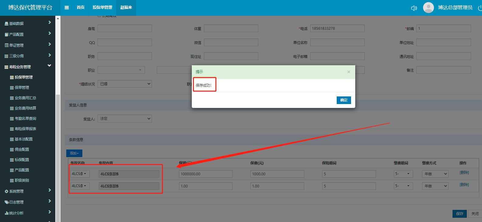 博达服务器 寿险业务→投保单管理,在投保单中,选择条款信息,添加两条附加险,没有主险,可以正常保存。在没有主险的情况下投保单不应该被正常保存