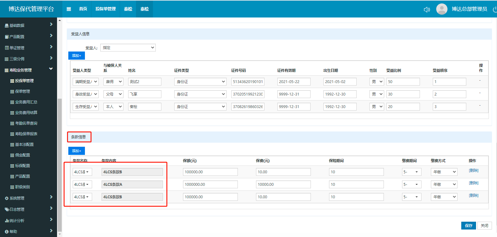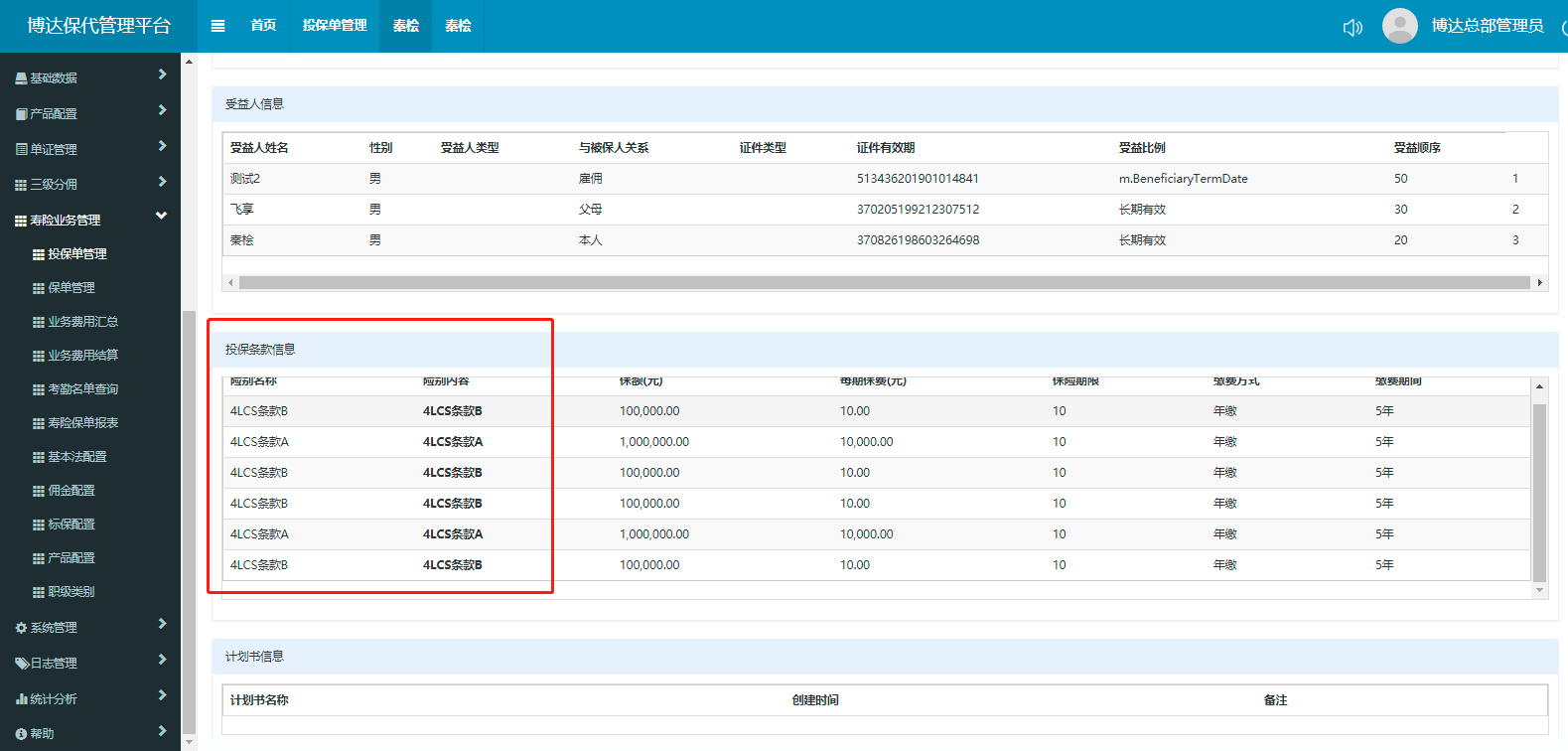 博达服务器中添加投保单,在条款信息中添加一条主险两条附加险后保存,点击查看显示两条主险四条附加险。条款信息显示错误详情见截图