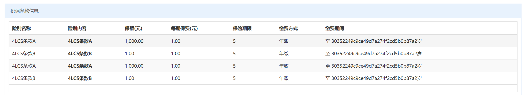 在投保单查看中投保条款信息缴费期间显示错误,如图1所示
