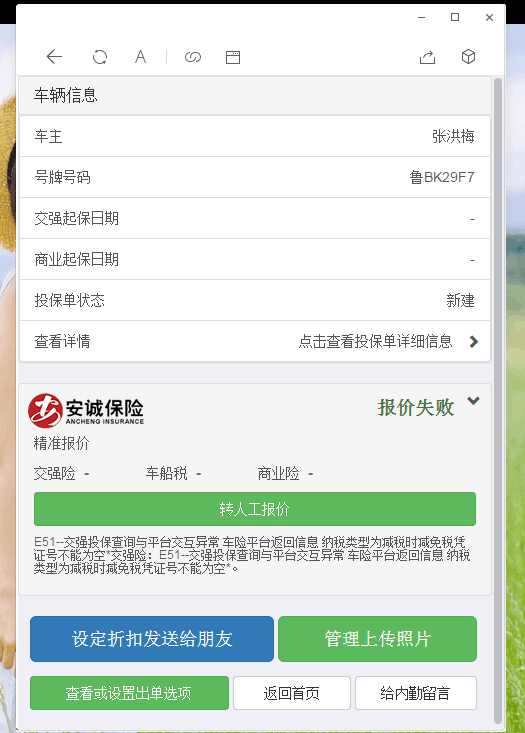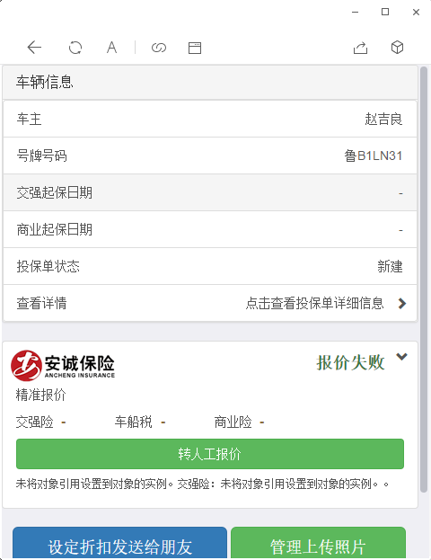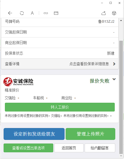 安诚报价提示:“未将对象引用设置到对象的实例。”参数核实正确,可扫描并下载保单,只有报价时提示“未将对象引用设置到对象的实例”。