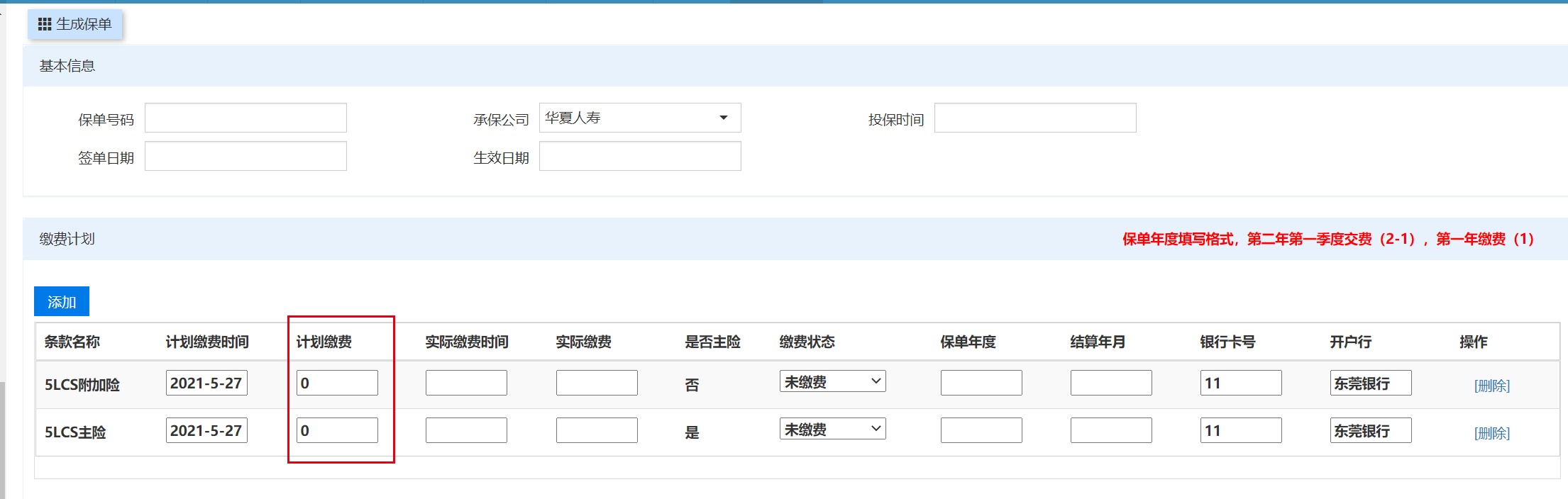 投保单提交到已出单时计划缴费应该自动带出,如图所示