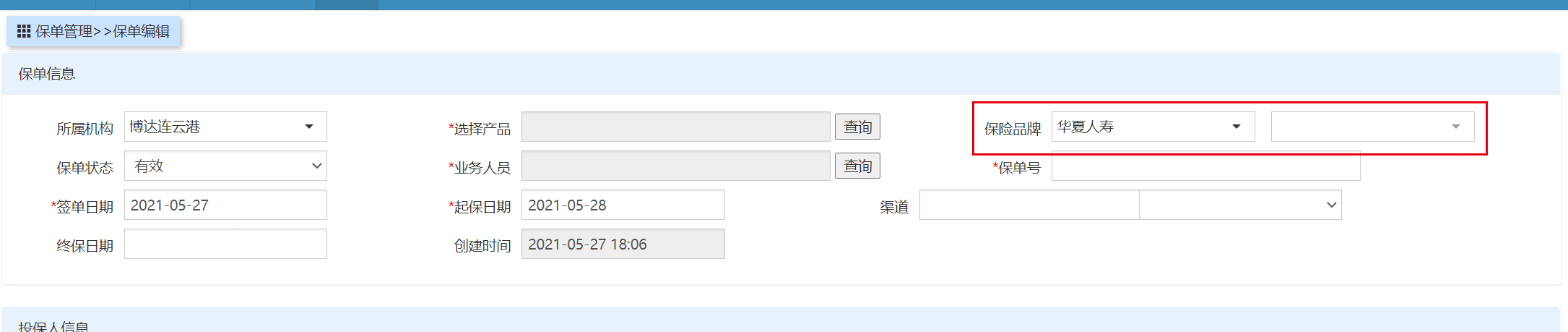 保单新添时,不应该存在默认保险公司,如图所示