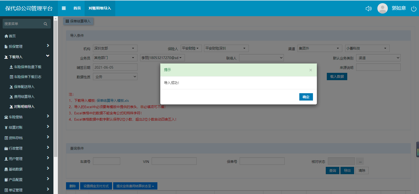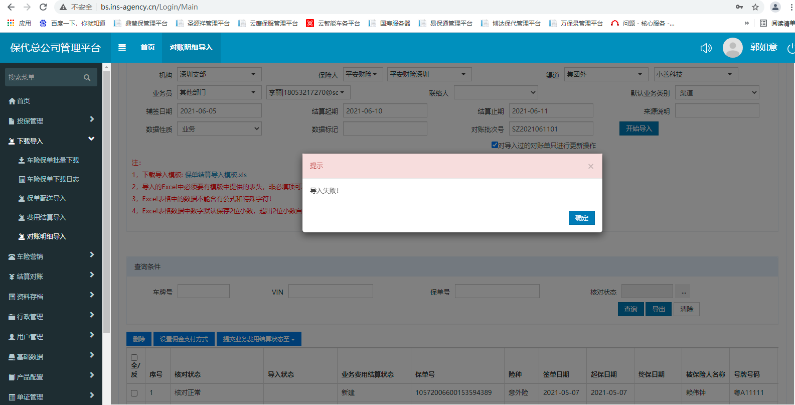 捷顺保险管理平台中对账明细导入时,数据进行预处理成功,但是开始导入系统时失败