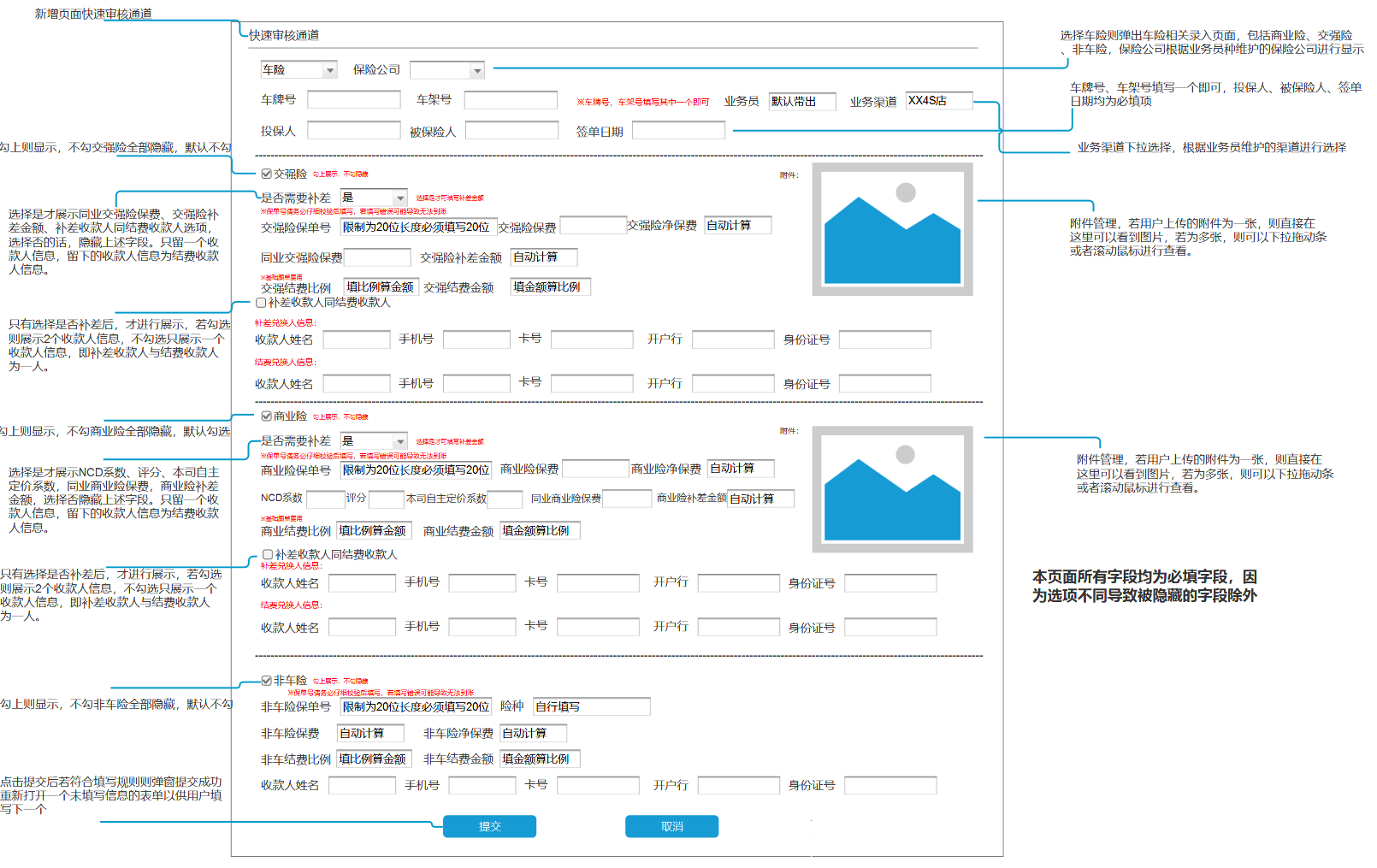 1、新郑快速审核通道页面,以供用户填写基本数据,具体页面详情如图《平安需求1》、《平安需求2》所示。用户提交之后,自动根据用户填写的信息,生成投保单,并且自动提交权益审核。