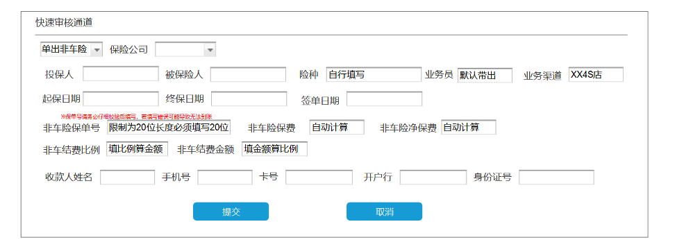 ————答:流水个数最多为5个:商业险两个流水(结费和附加流水),交强险两个流水(结费和附加流水),非车一个流水(结费流水);【同业商业险保费】不能大于【商业保费】