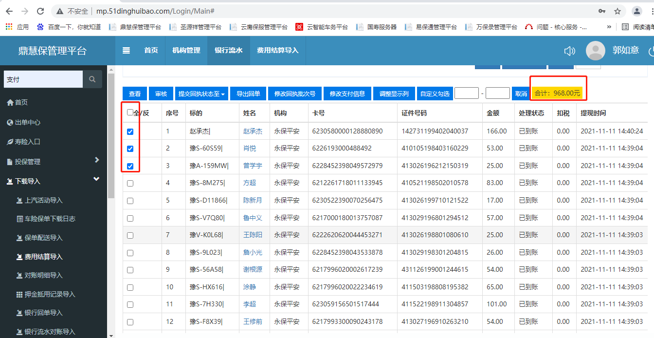 鼎慧保服务器中,永保平安机构下,查询银行流水,自定义勾选合计金额不准确,勾选部分流水后,点击全选,合计金额不会计算当前被选中的页面金额,取消全选后