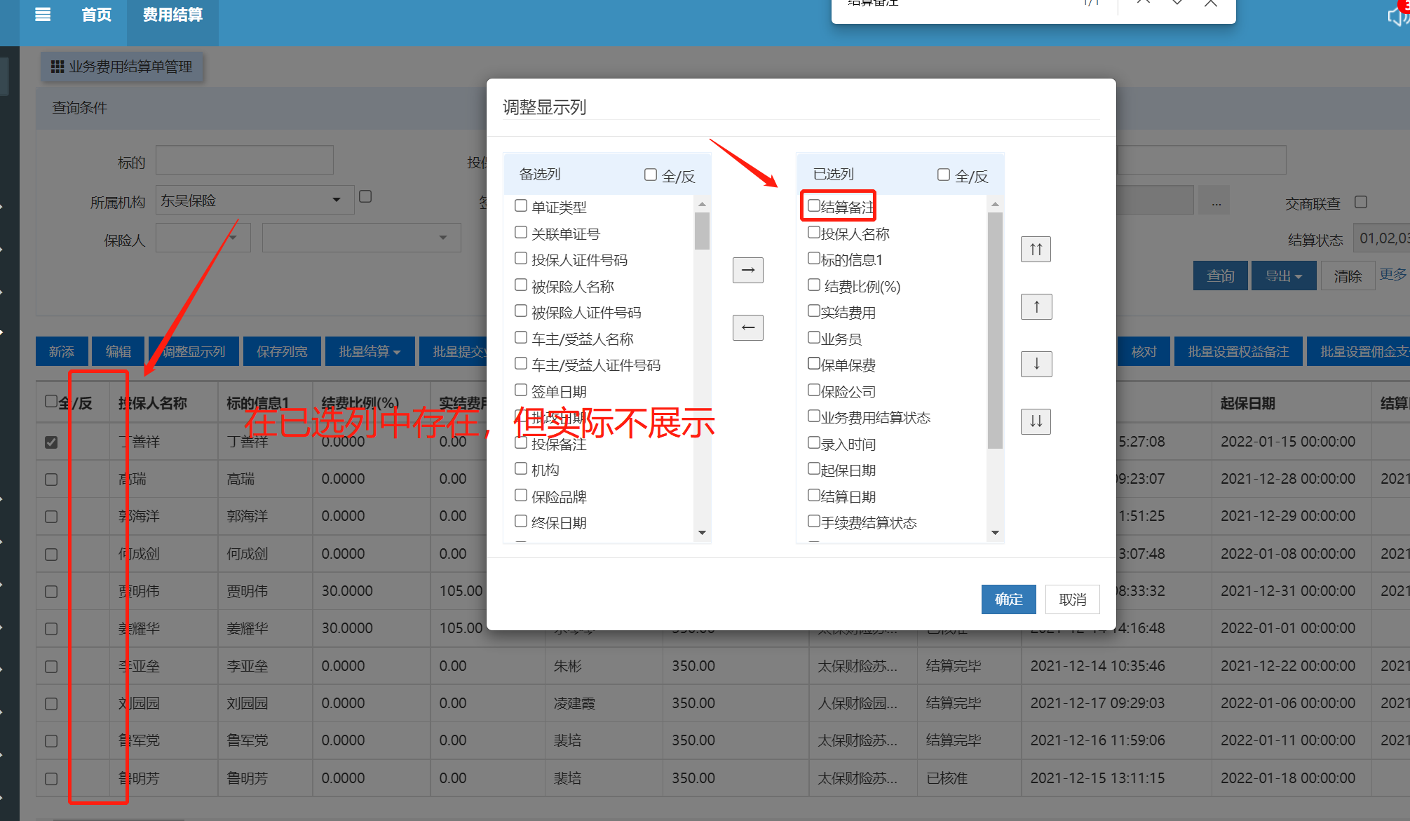 费用结算管理列表页面调整显示列,结算备注列无法展示,详情请见图。网址:http://mp.natureauto.com账号:wangh@dw密码:123456
