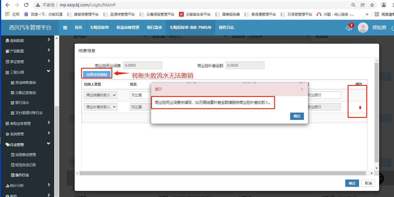 转账失败,但是投保单中无法进行修改,提示“商业险同业保费未填写,如无需结算补差金额请删除商业险补差收款人。”