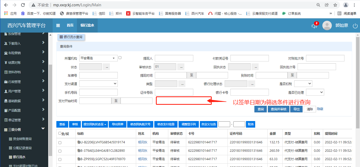 平安青岛机构下,三级分佣-银行流水中:在银行流水添加一个查询条件,按照签单日期为查询条件,批量查询签单日期为某个时间段内的流水,然后批量进行支付操作